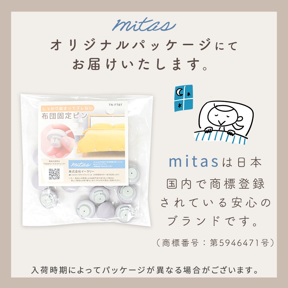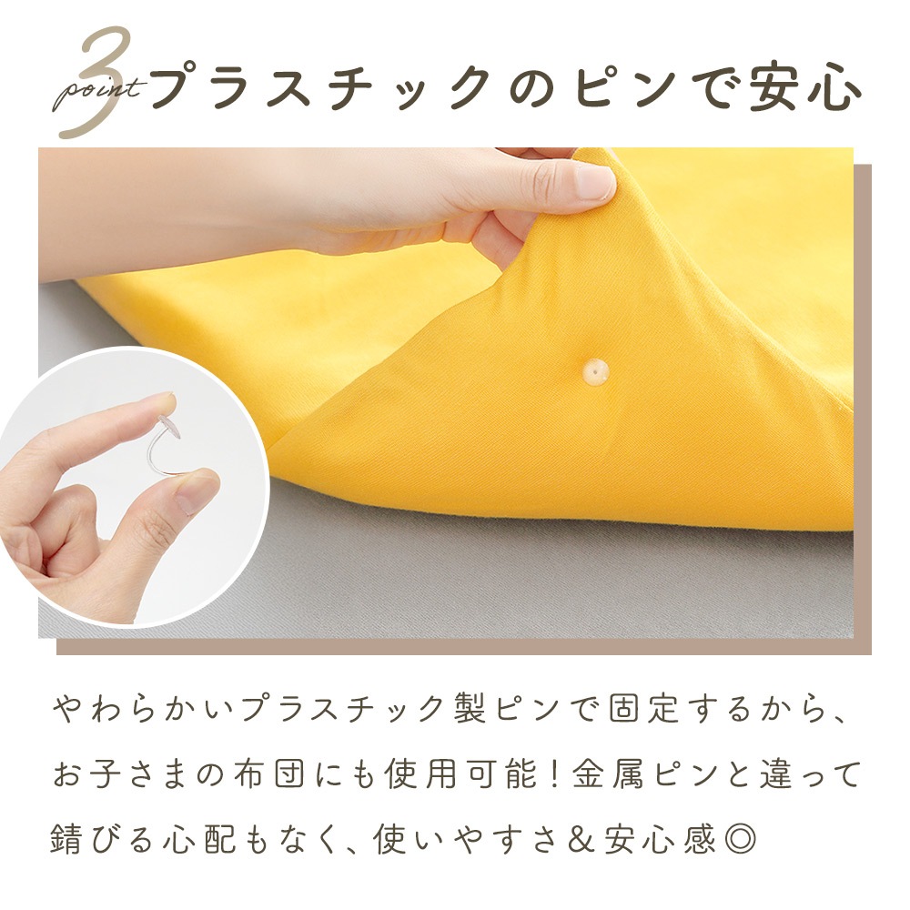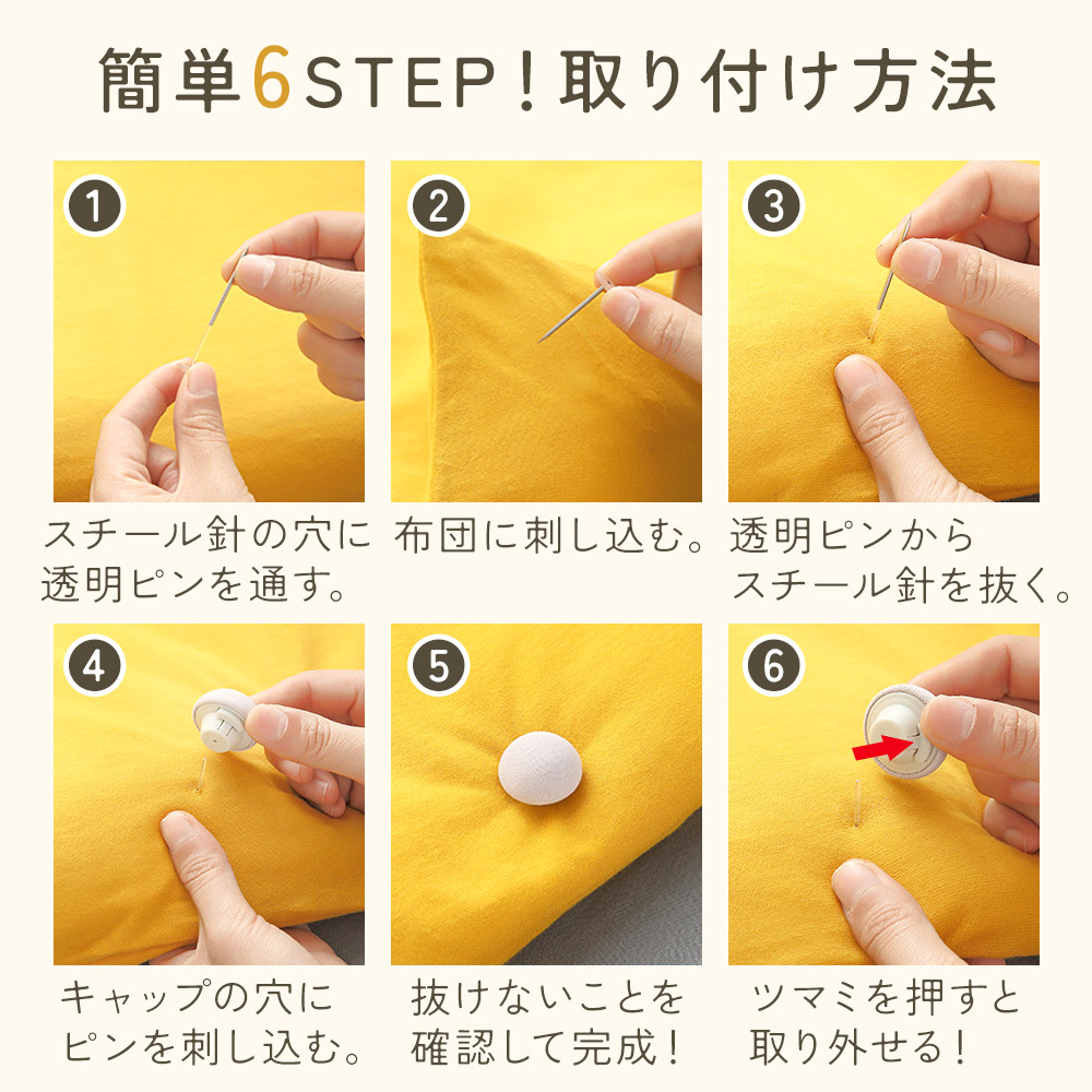 取り付けはとても簡単。布団やカバーに挟むだけでしっかり留まり、ピンや糸などの工具は不要。