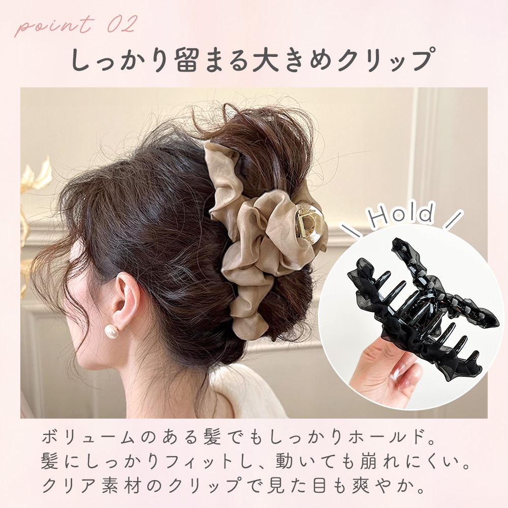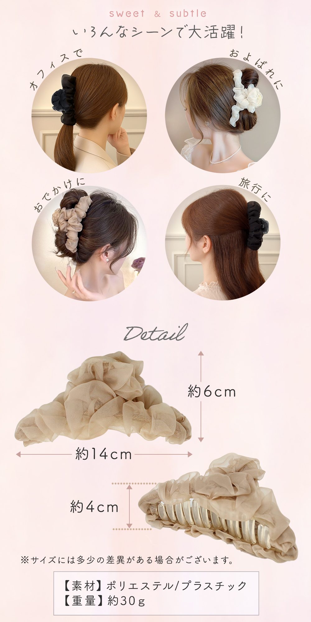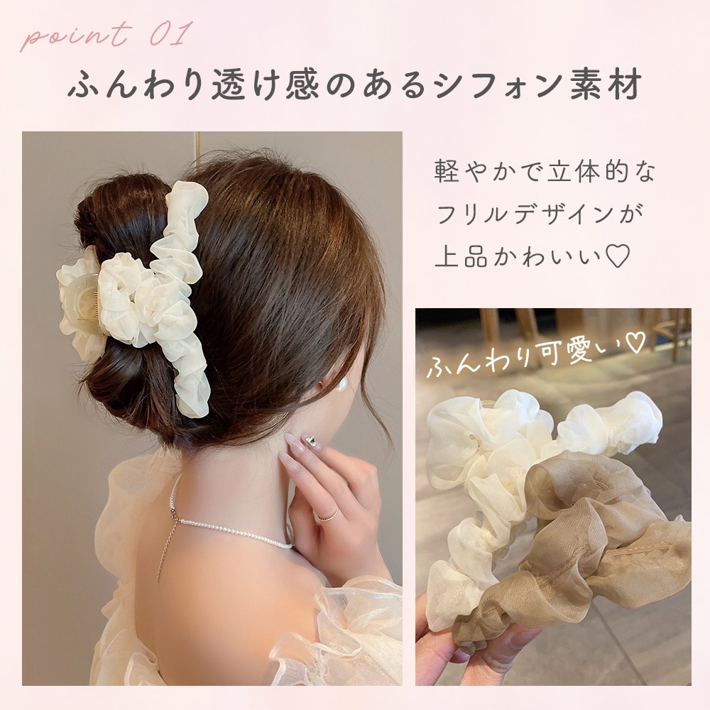 シフォン バンスクリップ ヘアクリップ 大きめ フリル ノーマル シンプル かわいい ヘアアクセサリー オーガンジー 立体 ギャザー 毛量 多い 多毛 まとめ髪