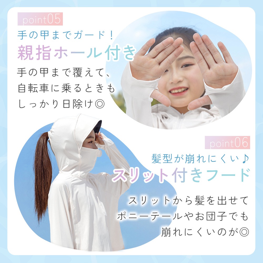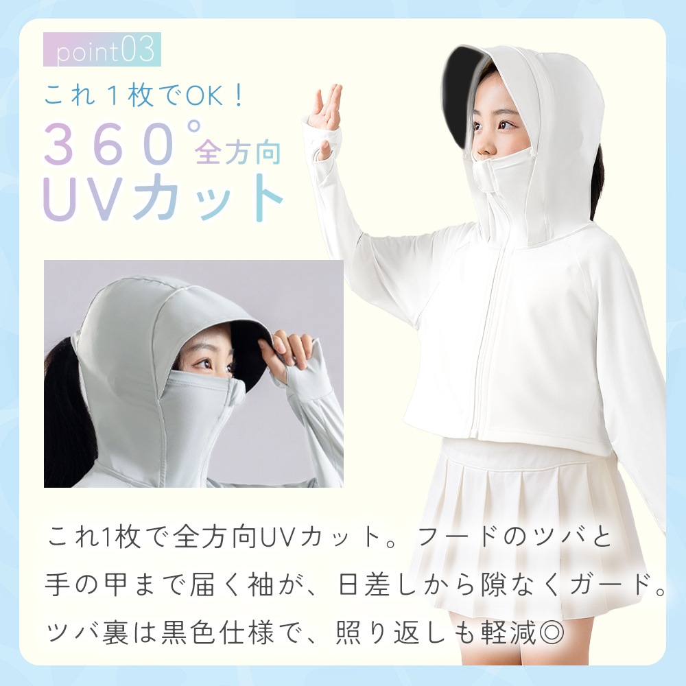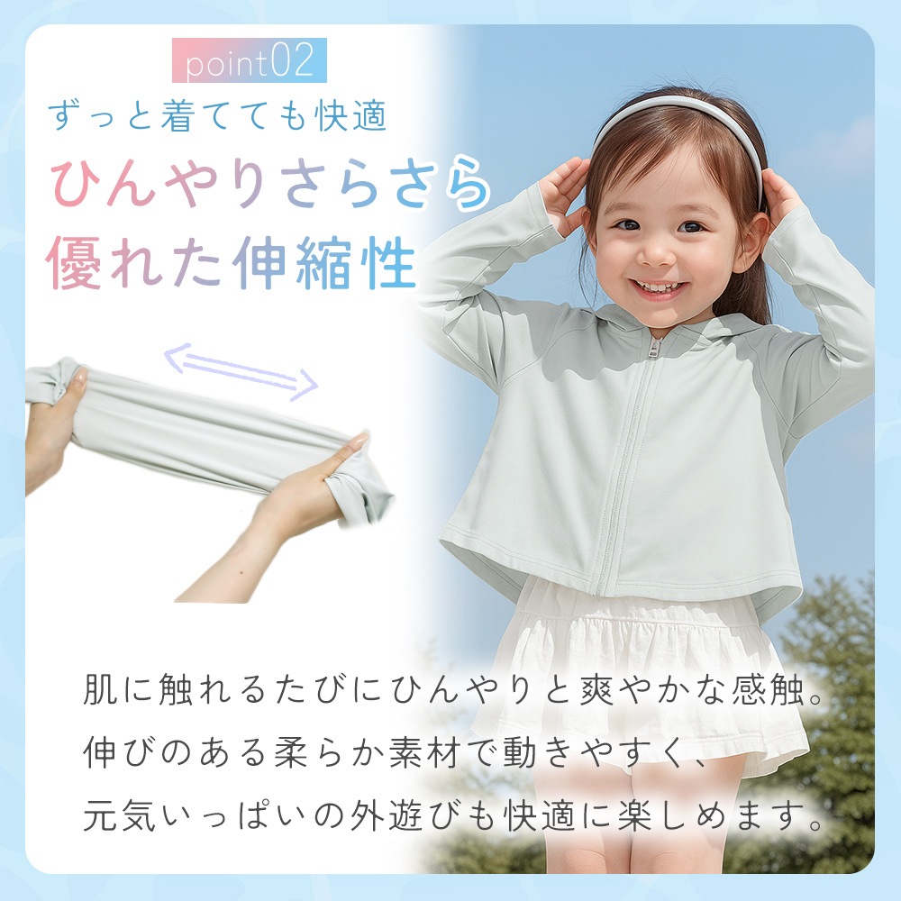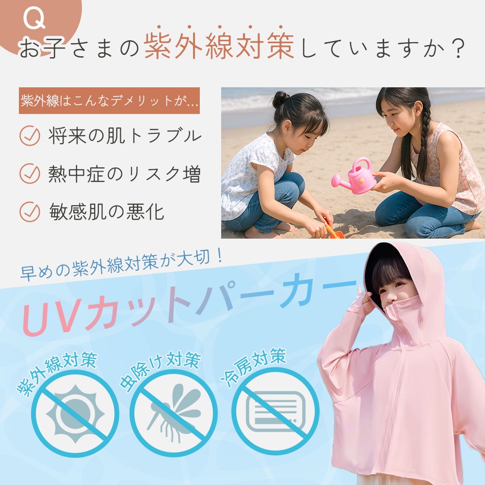 春先の紫外線対策、夏の虫よけや涼感ウェアとして、秋の冷房・冷え対策までオールシーズン使える便利なキッズ用日除けパーカー。