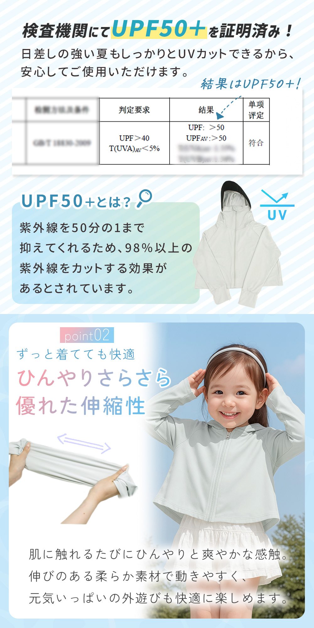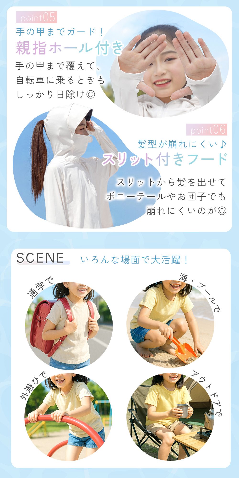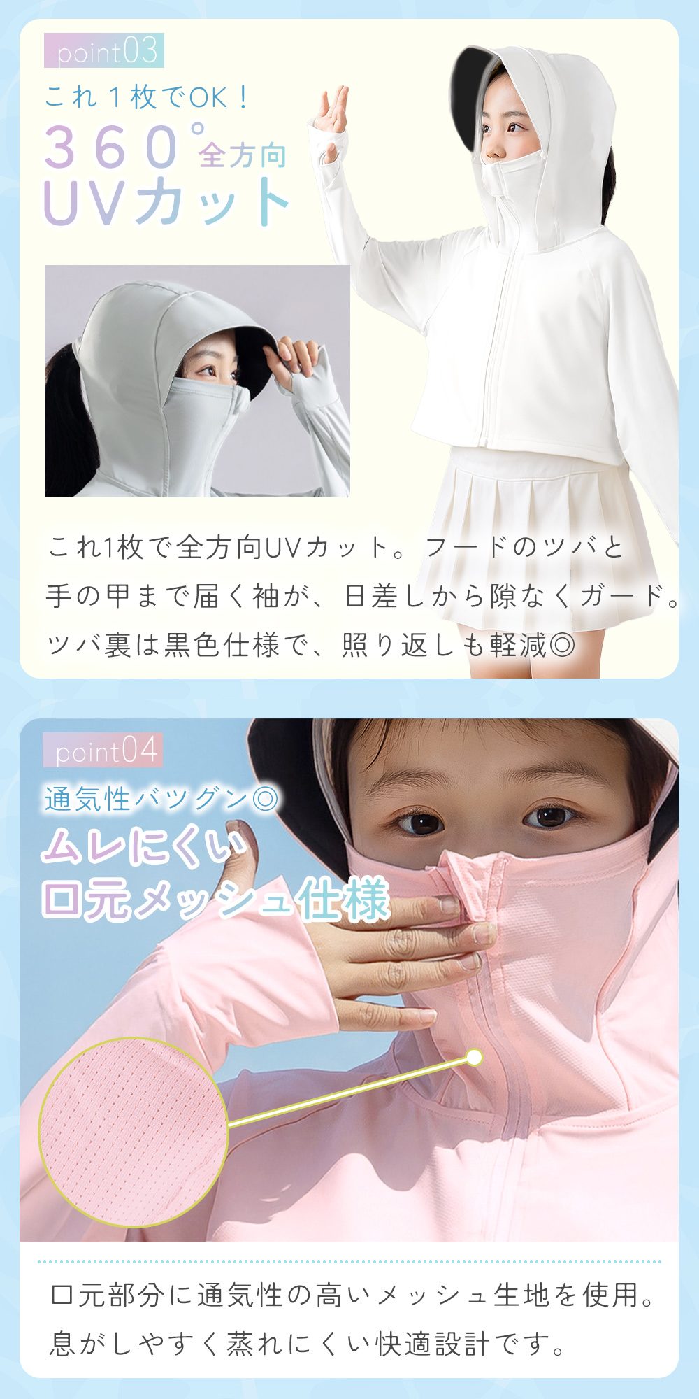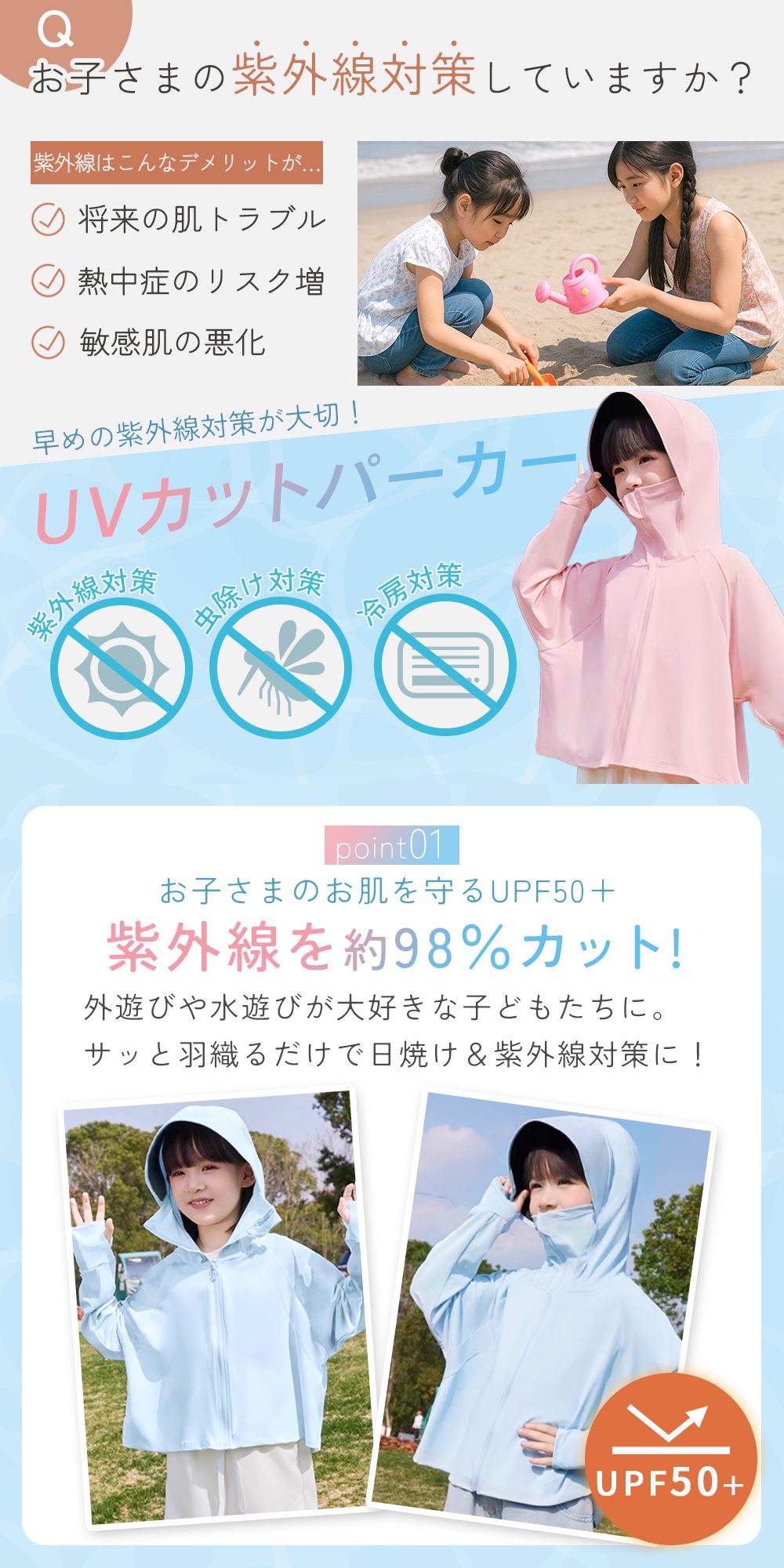 春先の紫外線対策、夏の虫よけや涼感ウェアとして、秋の冷房・冷え対策までオールシーズン使える便利なキッズ用日除けパーカー。