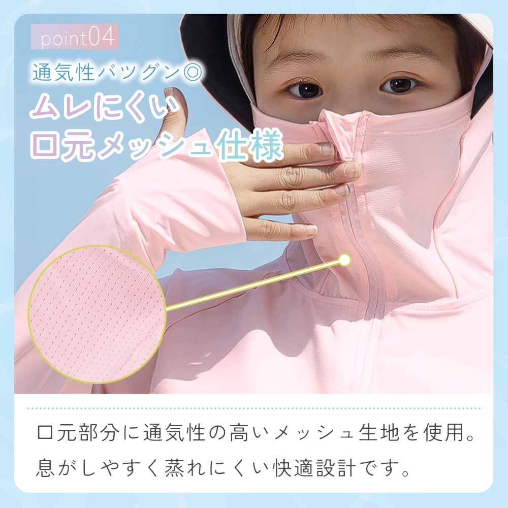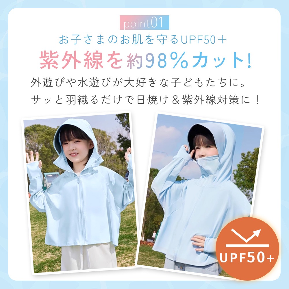 春夏秋の季節にぴったりのキッズ日除けパーカーです。紫外線をしっかり防ぎ、日焼け対策に最適。