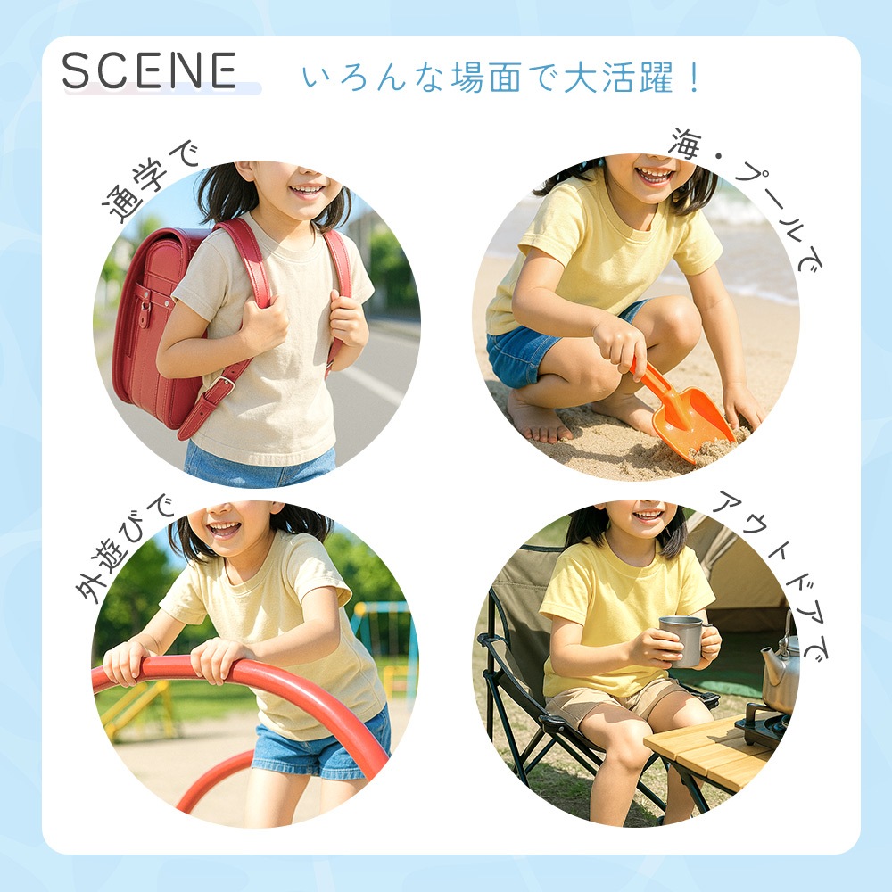 プールや海水浴などの水遊びはもちろん、川や山でのキャンプ、登山や遠足、運動会や部活動、スポーツ観戦など幅広いシーンで活躍します。