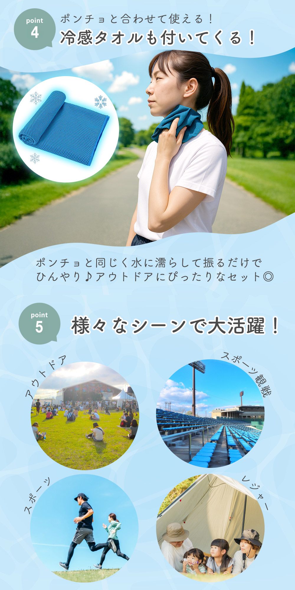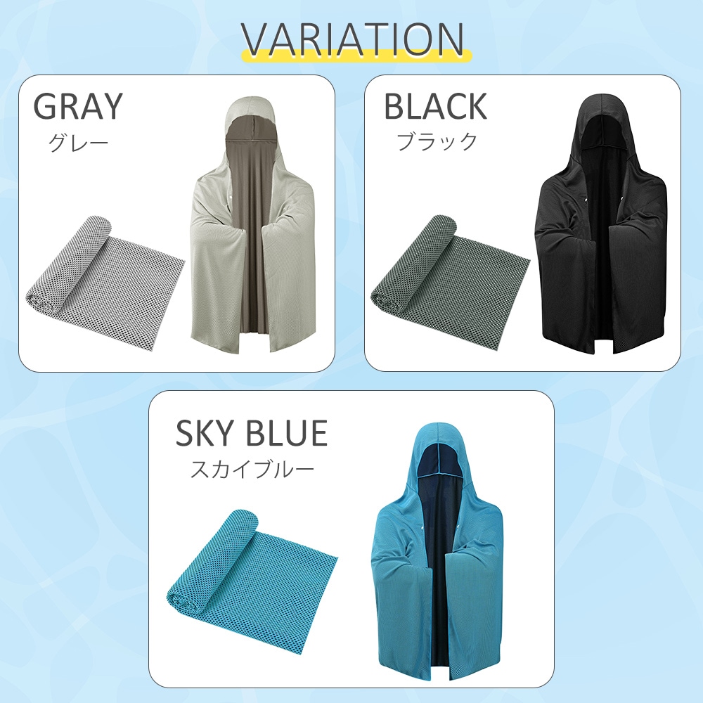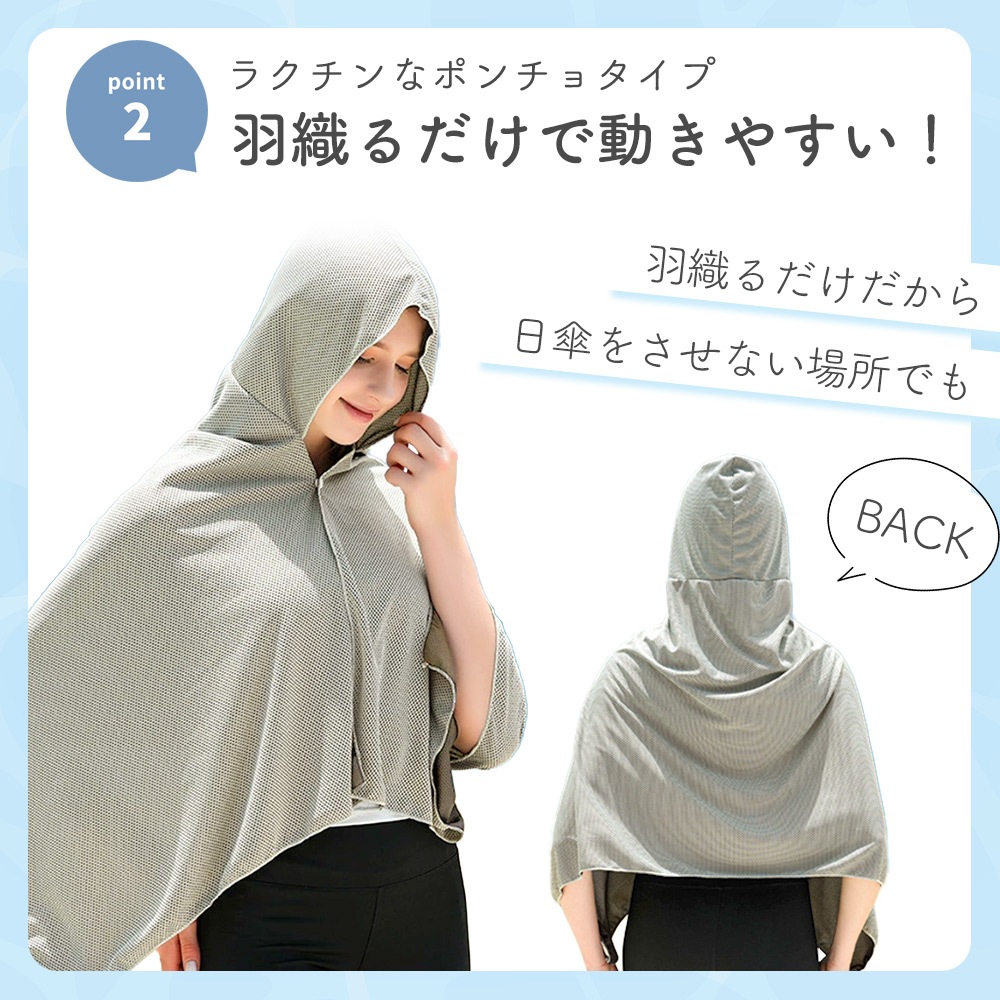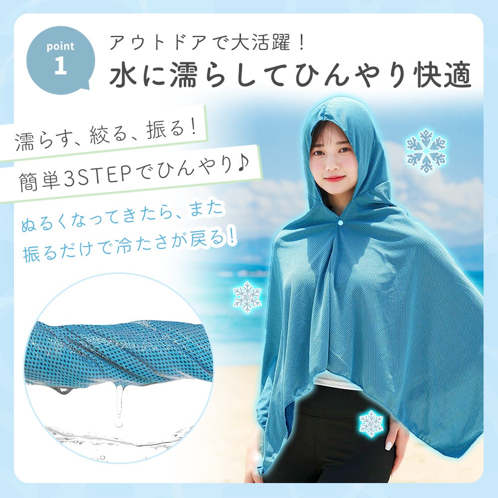 冷感ポンチョとして羽織るだけでなく、冷感ストールや冷感タオル、クールパーカーとしてアレンジ可能。