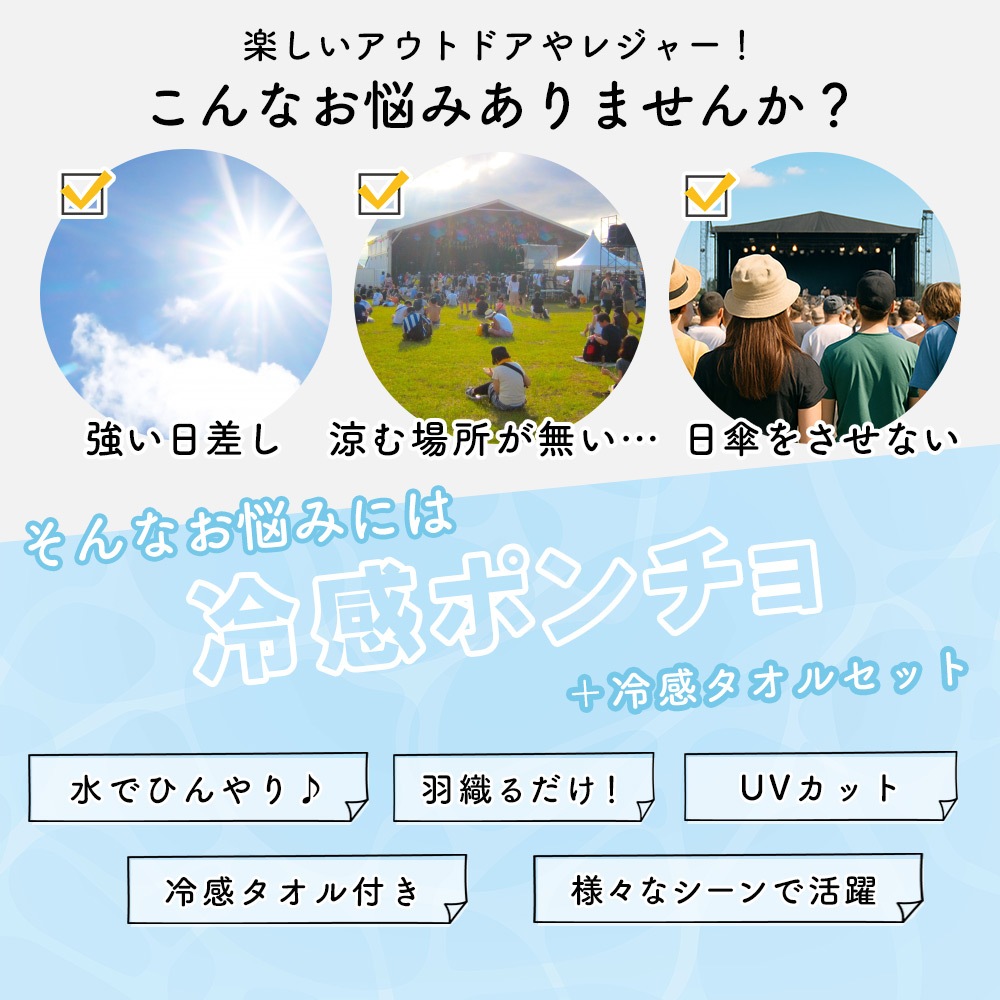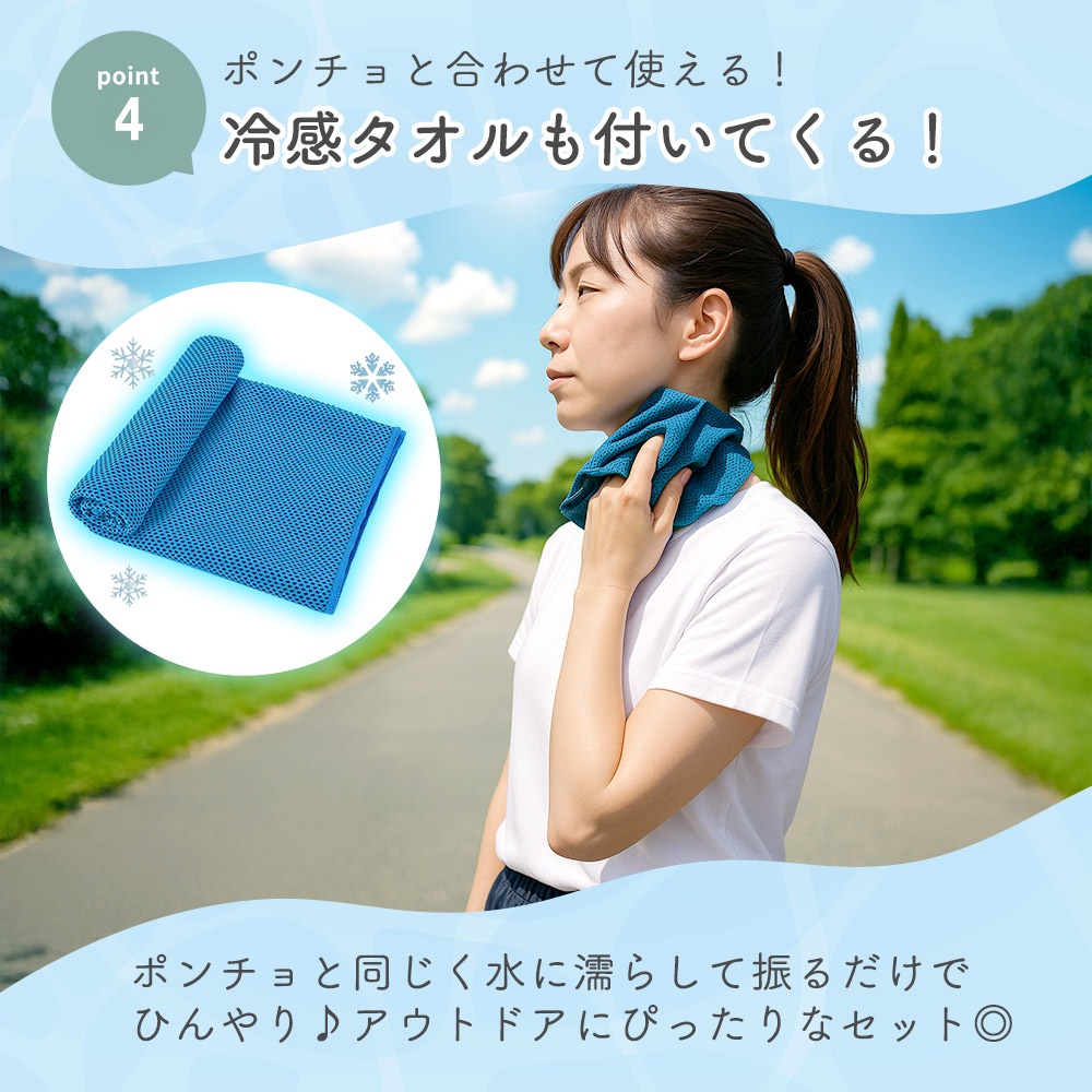 夏の強い日差しや暑さ対策に欠かせない、冷感ポンチョと冷感タオルのセットです。