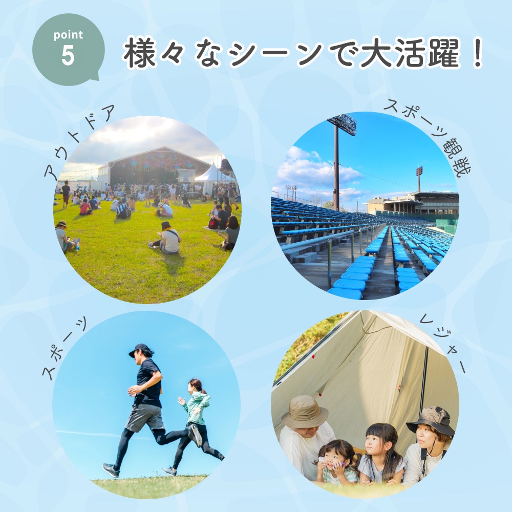 スポーツ観戦や運動会、フェス、アウトドア、海やプールなどのレジャーにも大活躍。