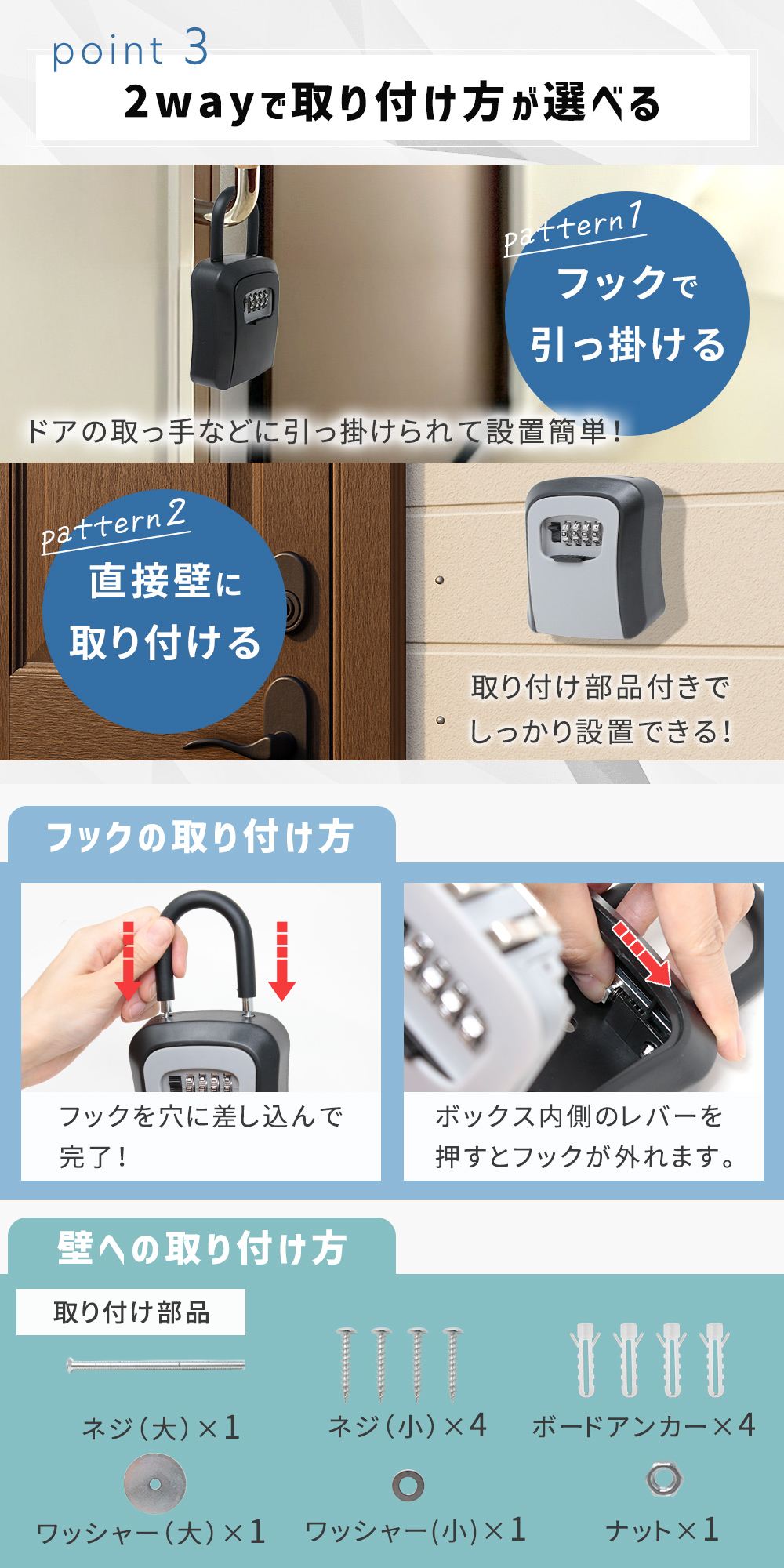 防犯 キーボックス ダイヤル式 ボックス 鍵 貴重品 取り付け フック 2way 玄関 収納 フック付き 収納ボックス 壁掛け 屋外 受け渡し 家族同士 鍵の共有 家族