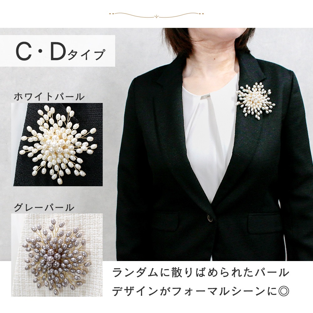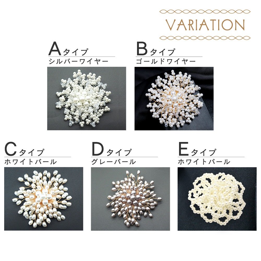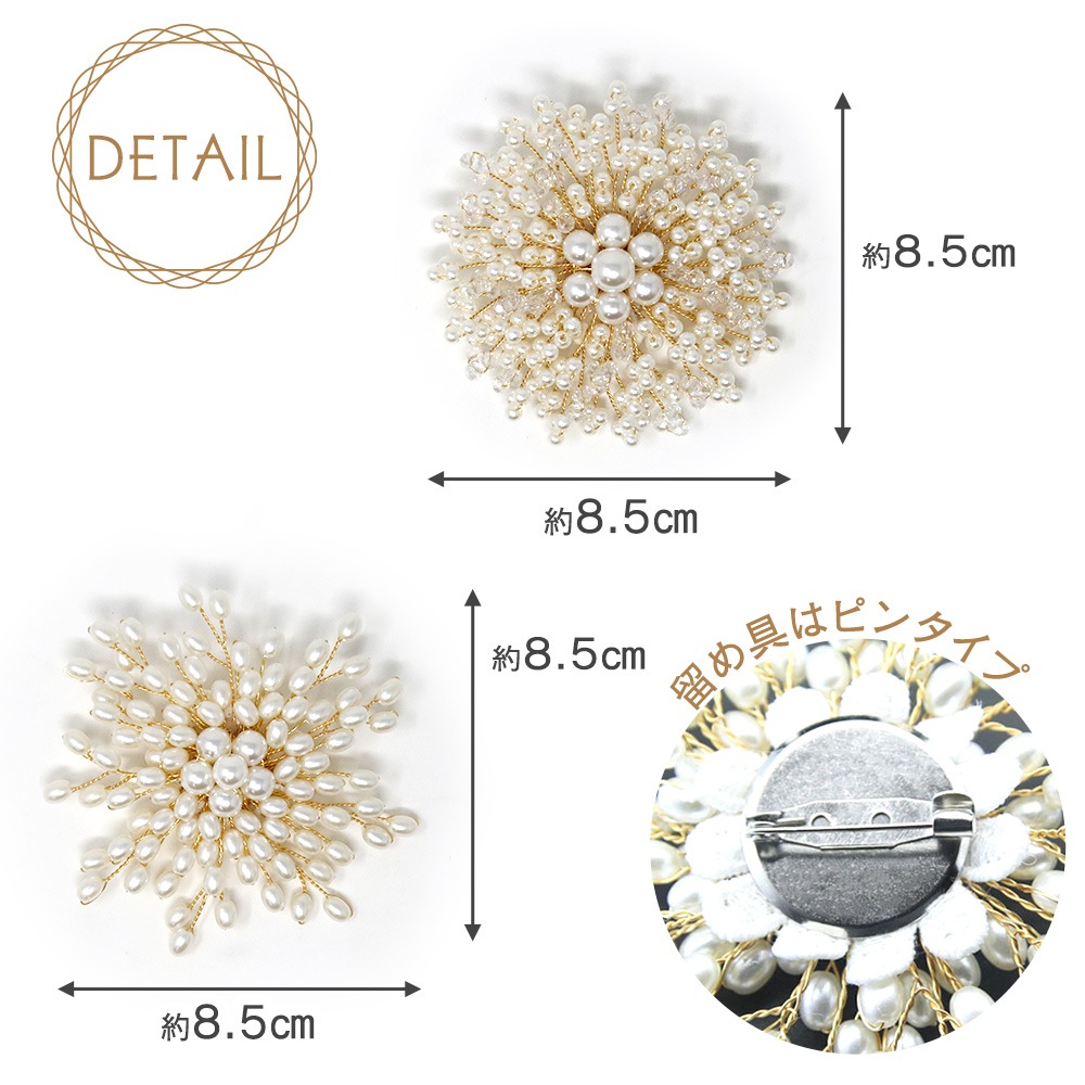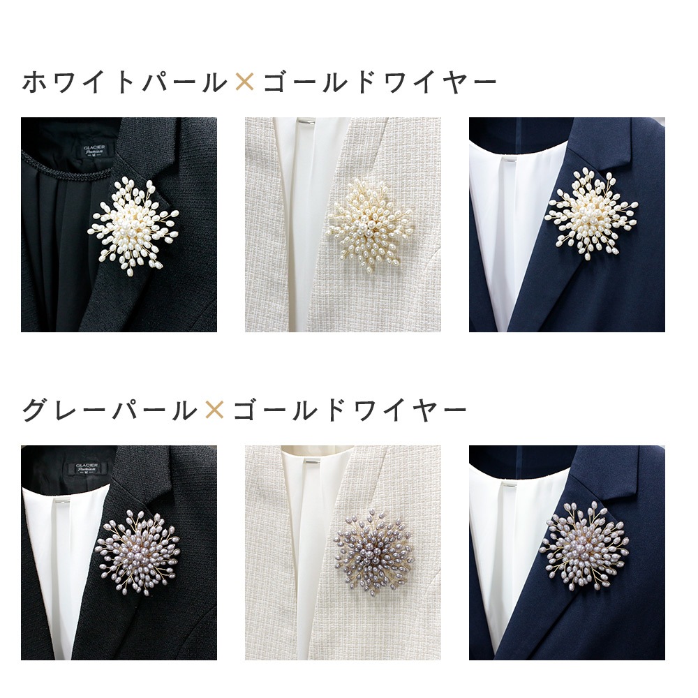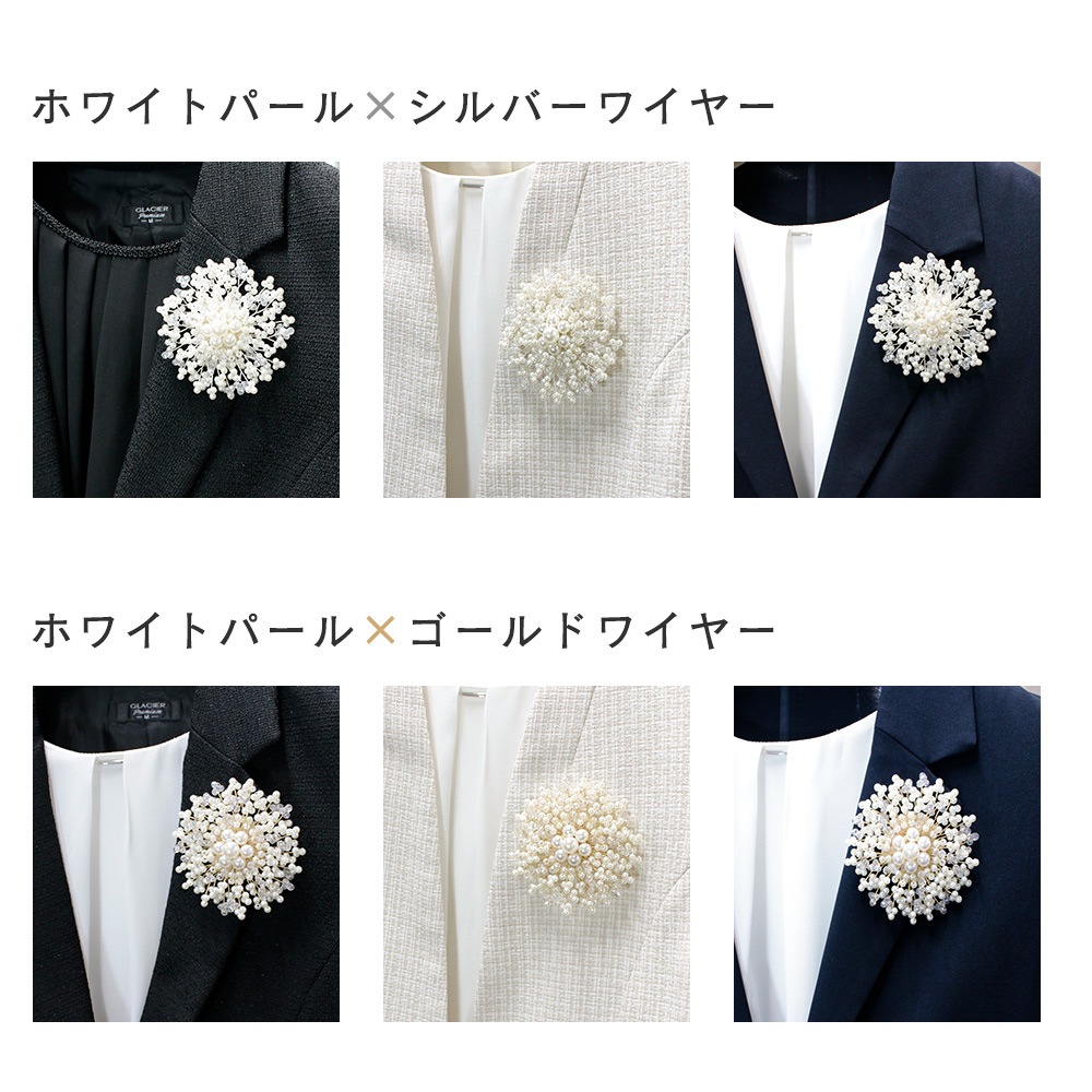 直径約8.5cmの大きめタイプと約6.5cmの繊細タイプ。ホワイトパール、グレーパール、ワイヤーはシルバーまたはゴールドから選択可能。シンプルなジャケットにも花のモチーフが映えます。