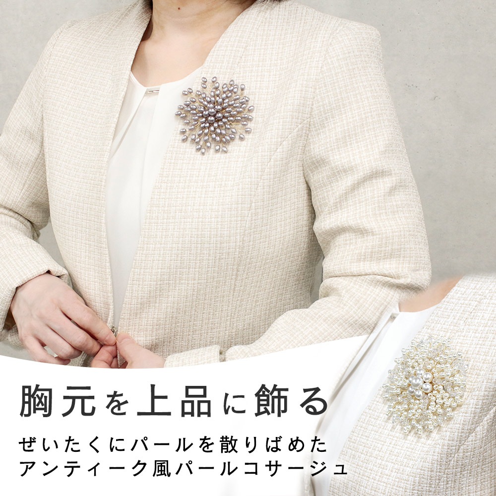 パールをぜいたくにあしらったアンティーク風コサージュ。スーツやワンピース、ジャケットに合わせるだけで胸元が華やか。入学式や卒業式、園式、卒園式などのセレモニーに映える上品なアクセサリーです。大人のコーディネートに馴染み、ママスーツとも好相性。ギフトにも最適。