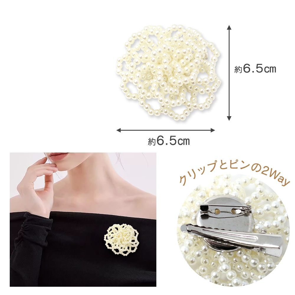 クリップとピンの2Way仕様。襟や胸元はもちろん、バッグやストール、小物にも着脱しやすくアレンジ自在。大人かわいい印象からフォーマルまで幅広く活躍。