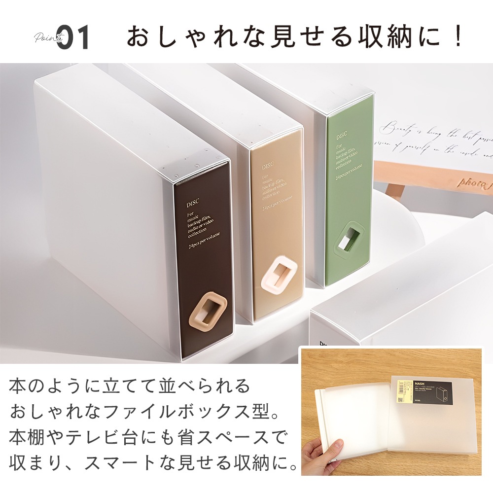 おしゃれでシンプルなファイルボックス型のDVD収納ケース。ブック型デザインで本棚やテレビ台、カラーボックスにすっきり収まり、インテリアになじむモノトーンやナチュラルカラーが魅力です。見栄え重視の方にもおすすめの省スペース設計。スタッキングしやすく、自立して並べ替えも簡単です。