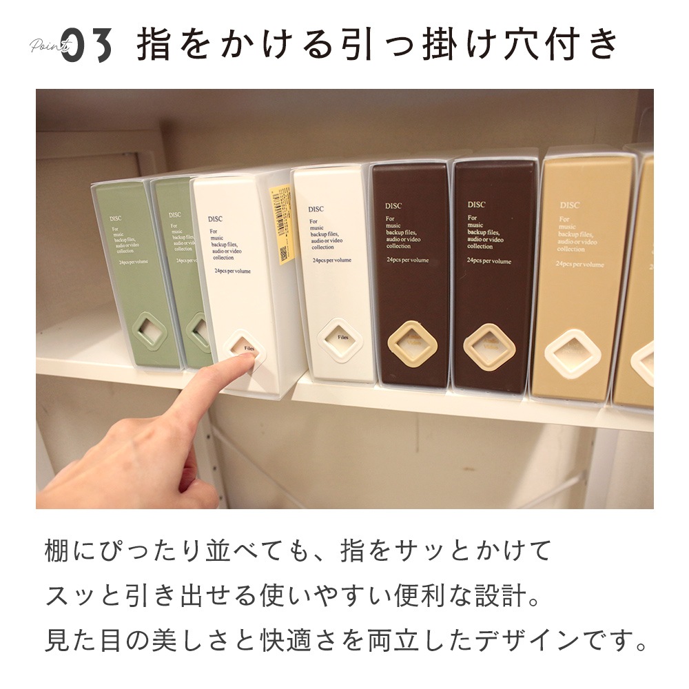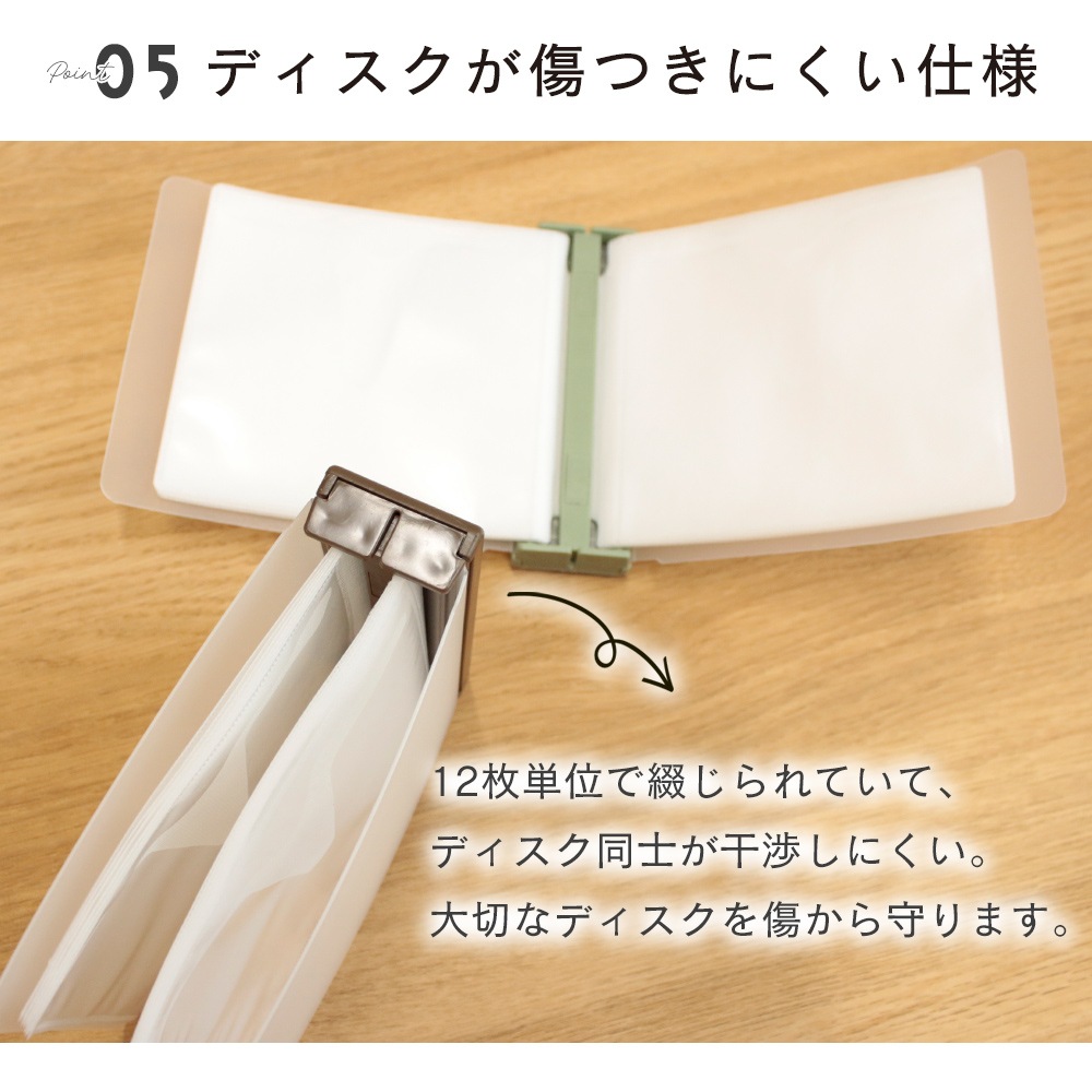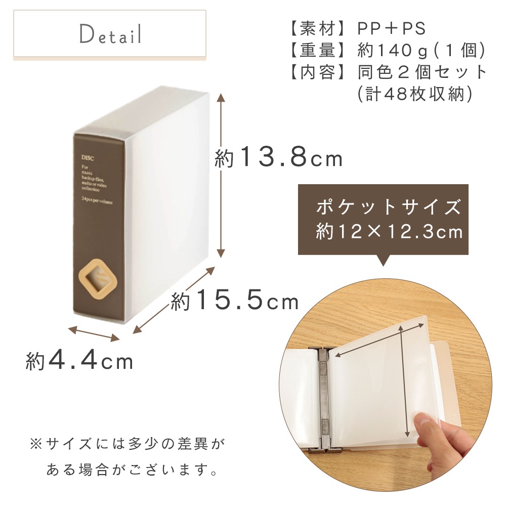 1冊あたり24枚収納、計48枚をまとめて収納。両面ポケットの不織布スリーブでディスク同士が擦れにくく、キズ防止と保護に配慮。CD、DVD、BD(ブルーレイディスク)、ゲームディスクまで幅広く対応します。
