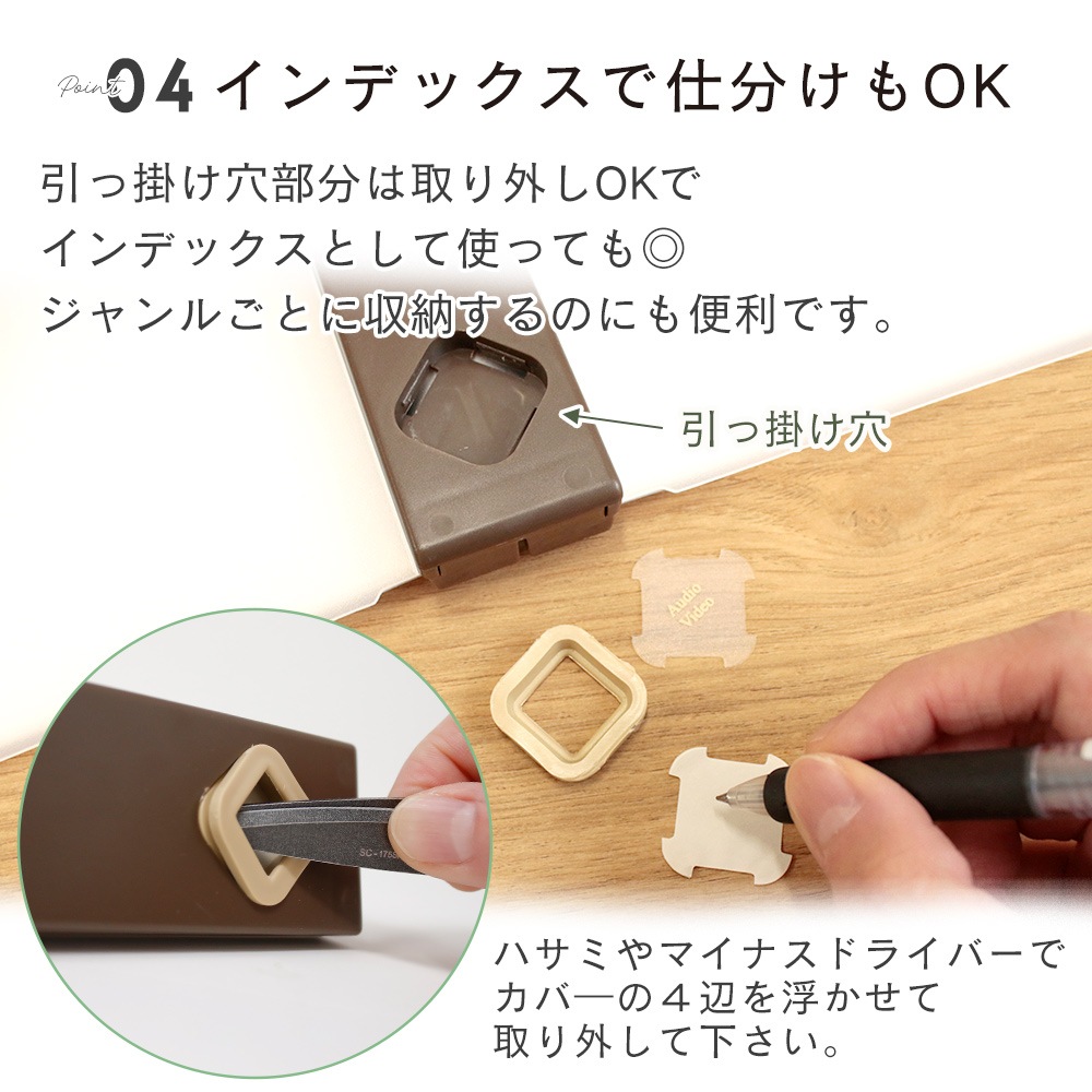 棚にぴったり入れても、前面の引っ掛け穴に指をかけてスッと取り出せる便利グッズ。背表紙風の面はラベル感覚で分類・仕分けがしやすく、コレクションや記録メディアの整頓に最適です。
