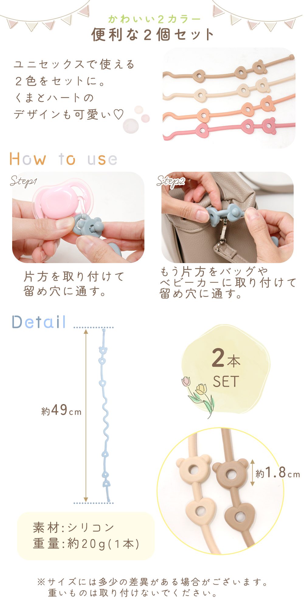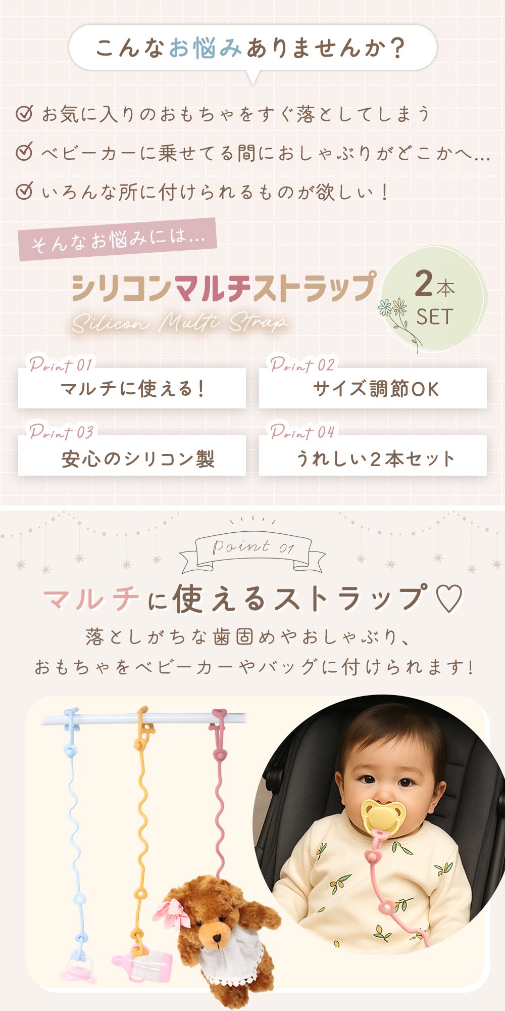 シリコンマルチストラップ 2本セット 多用途 トイ おしゃぶり おもちゃ かわいい 落下防止 ベビーカー 簡単巻きつけ 長さ調節 丸洗い やわらか ベビーグッズ