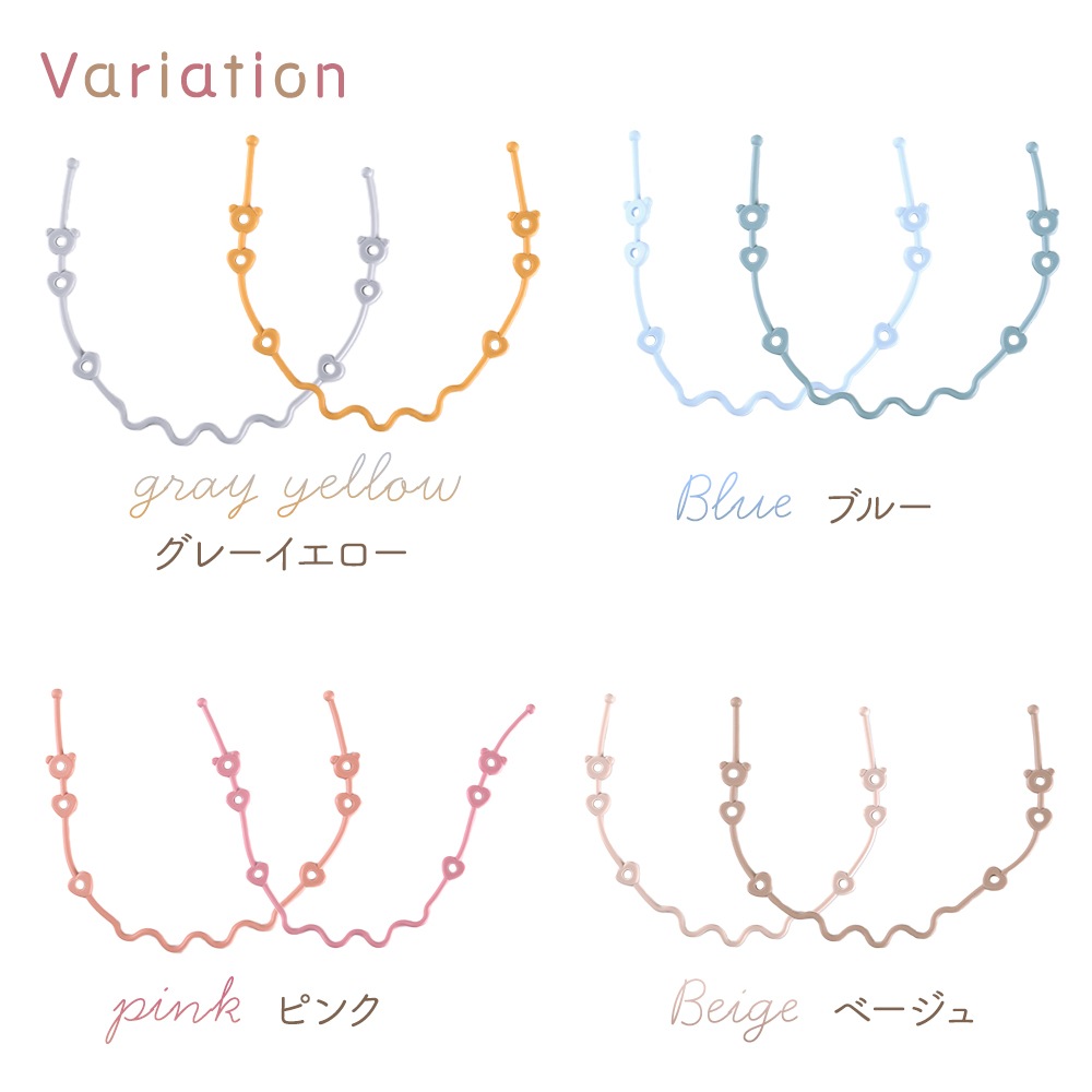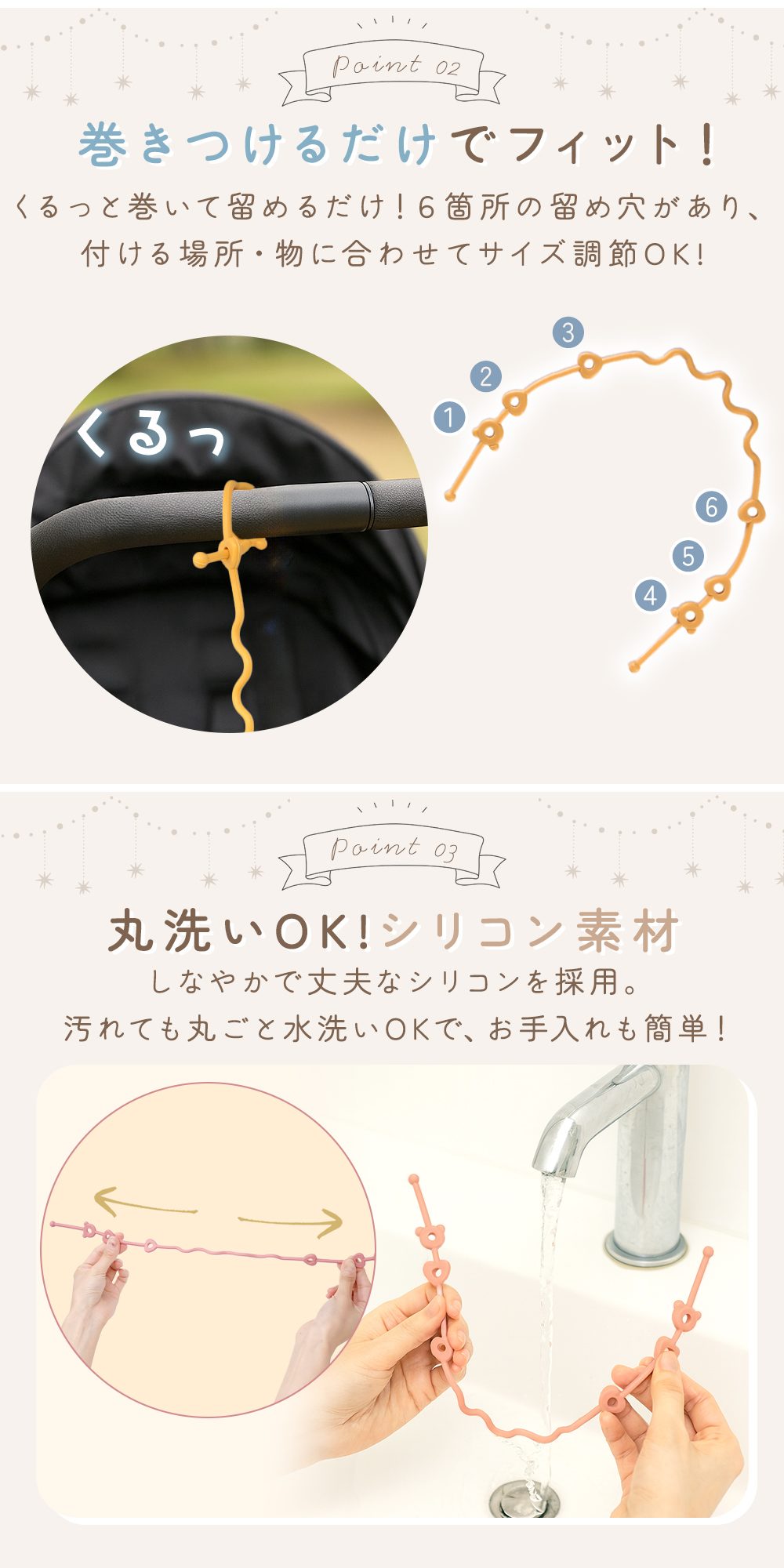 ベビーカーやバッグの持ち手にくるっと巻いて留めるだけ。留め穴が多い多穴設計で長さ調節可能(全長約50cm)。2本セットだから、外出用・おうち用・ベビーカー用など使い分けもスムーズです。
