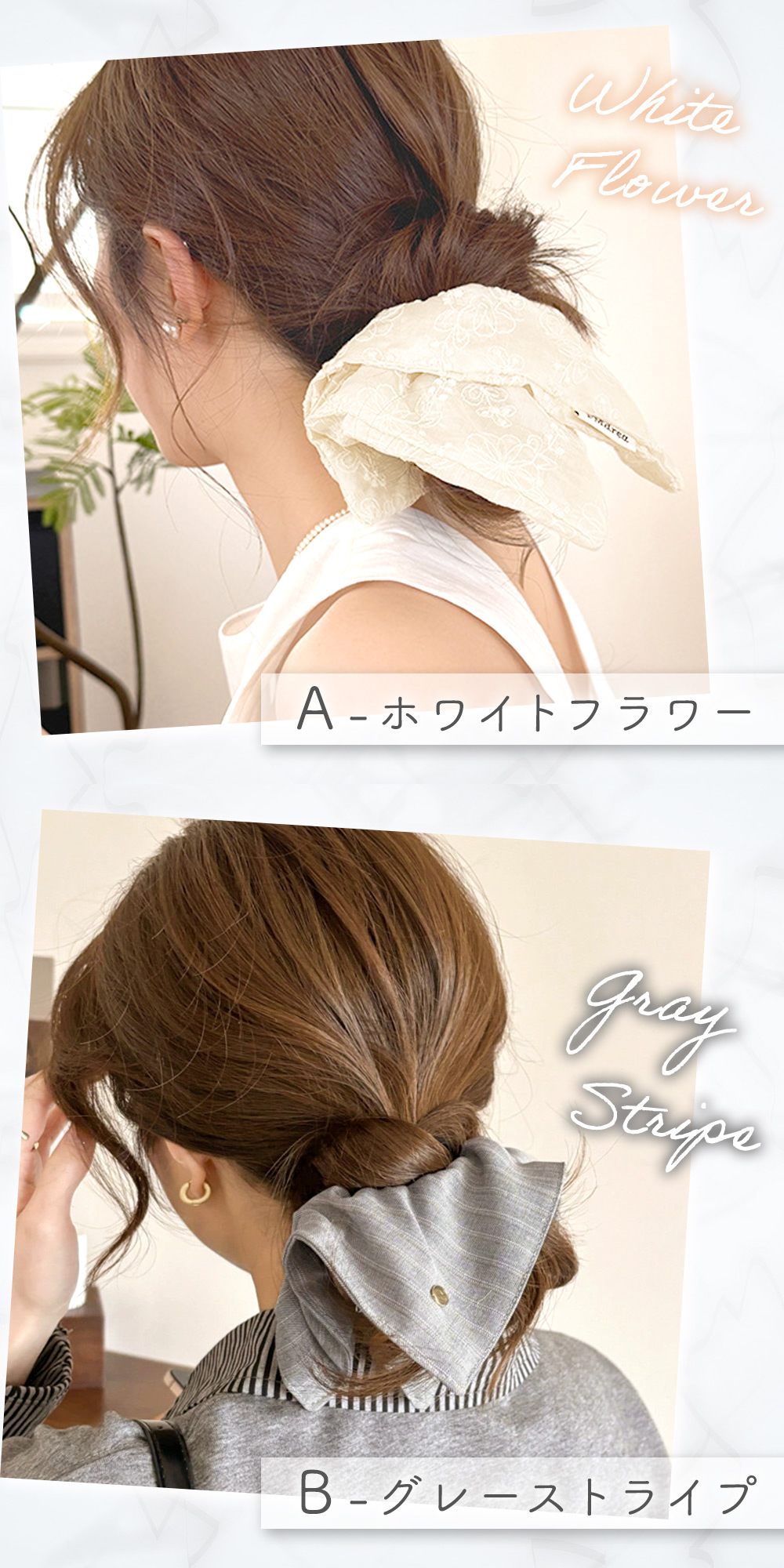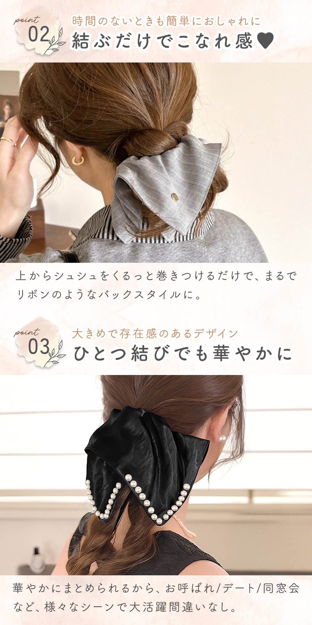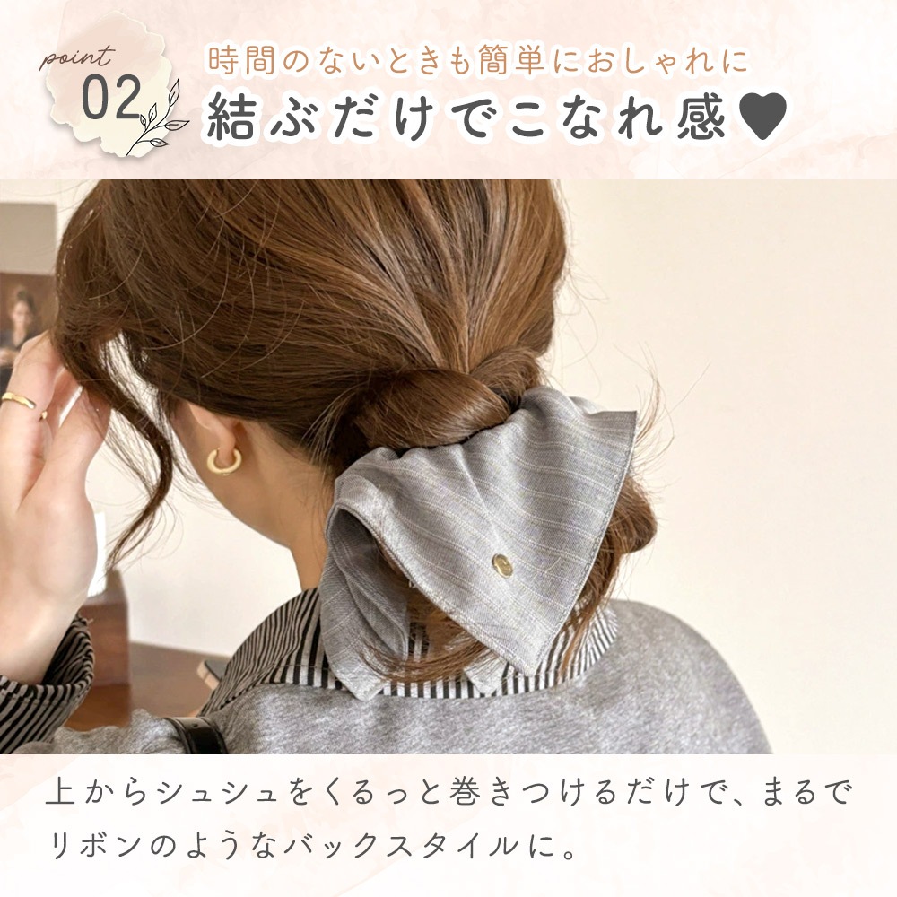 ヘアゴム一体型でお手軽。髪留めとしてくるっと巻けば、リボンのようなバックスタイルに。大きめでも軽やかに見え、レディースのデイリーからお出かけまで幅広く活躍します。