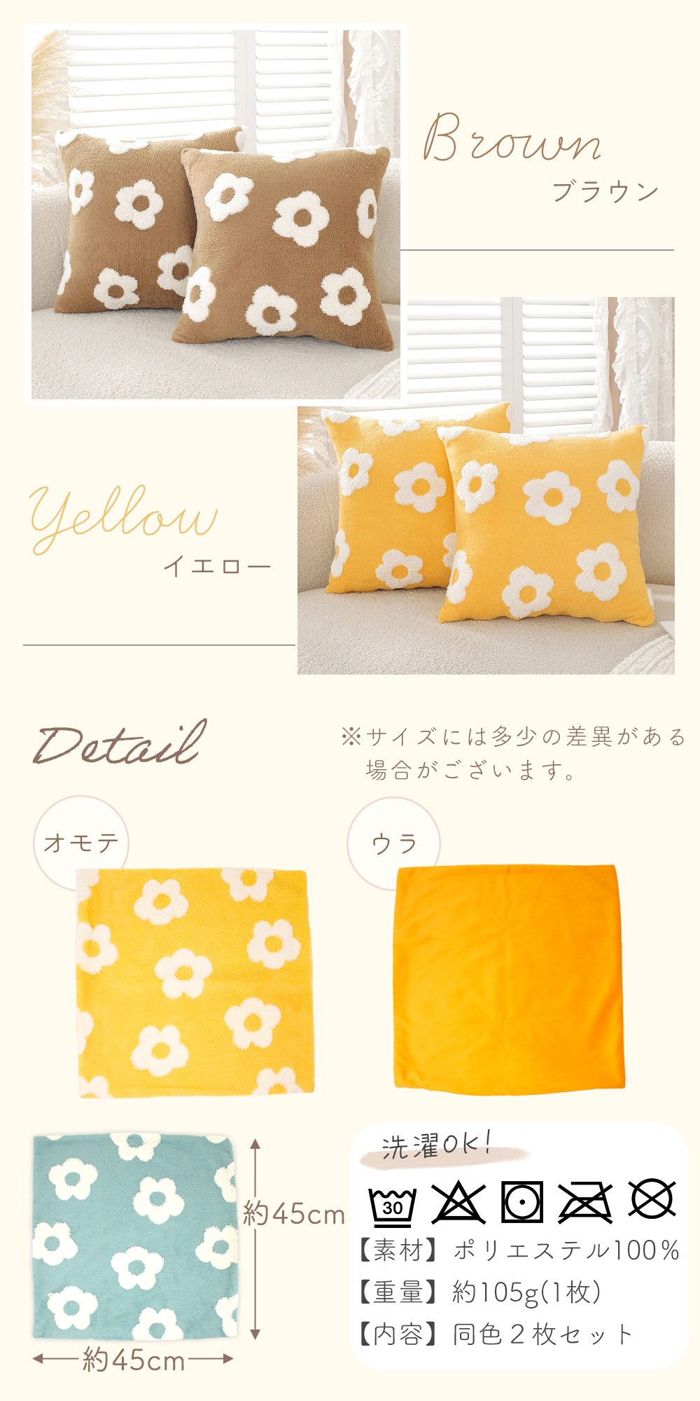 やさしい暖色系カラーとデイジー柄の組み合わせは、ナチュラルインテリアや北欧テイスト、韓国インテリアとも相性抜群。同色2枚セットで揃えることで、さりげなく統一感のあるおしゃれな空間に。リビングや寝室はもちろん、子ども部屋のクッションや座布団カバーとしてもかわいく使えます。