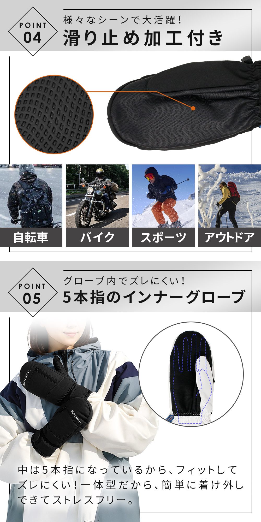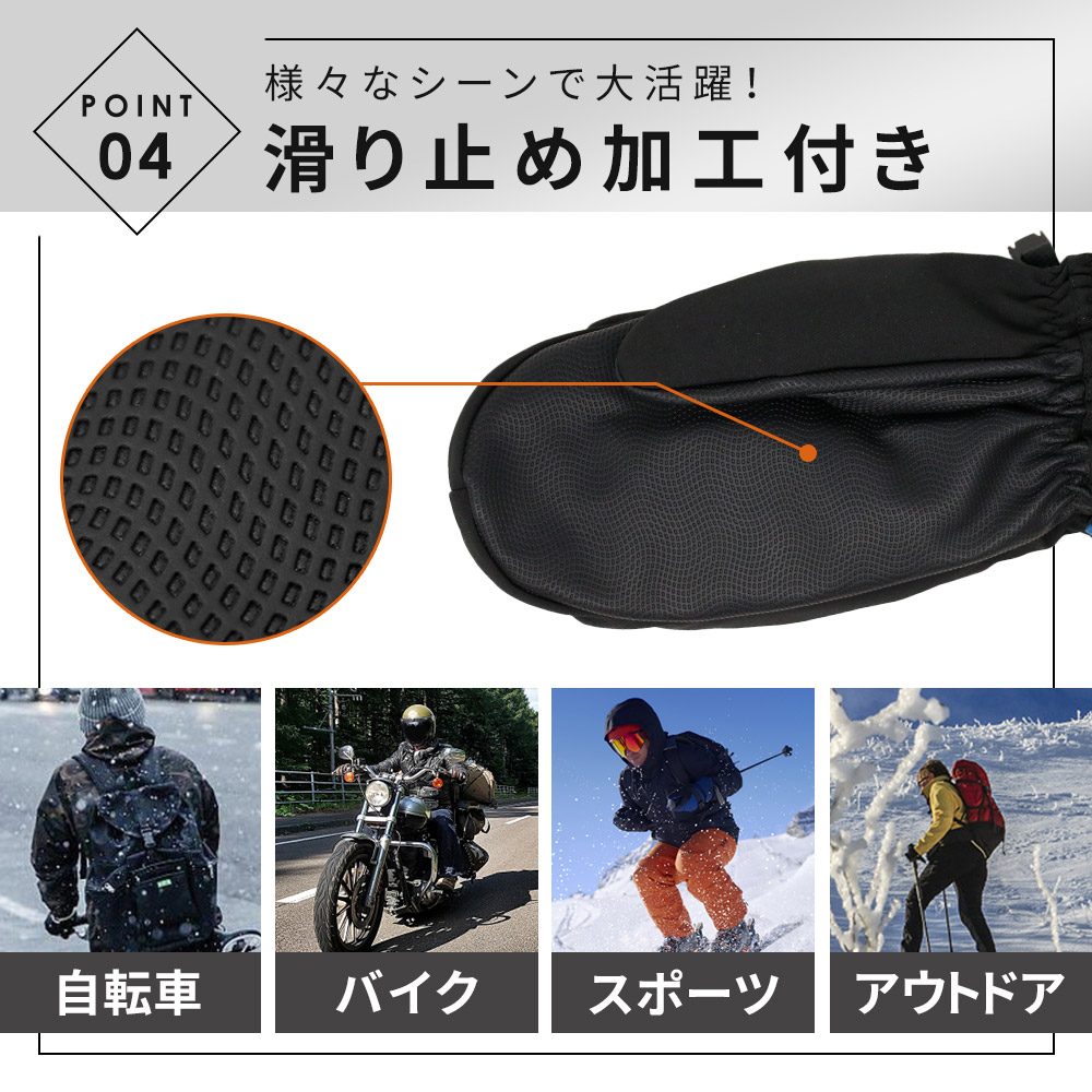 グローブ内でずれにくいから、自転車やバイク、スキー・スノボなどの動きの多いシーンでもストレスフリーです。