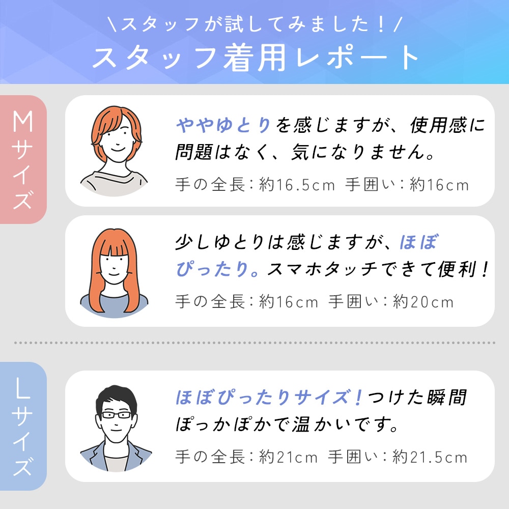手首まで包み込むシルエットで、すき間から冷気が入りにくく、ふんわりあたたかい着け心地。