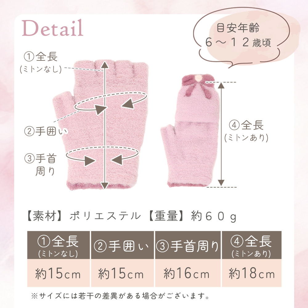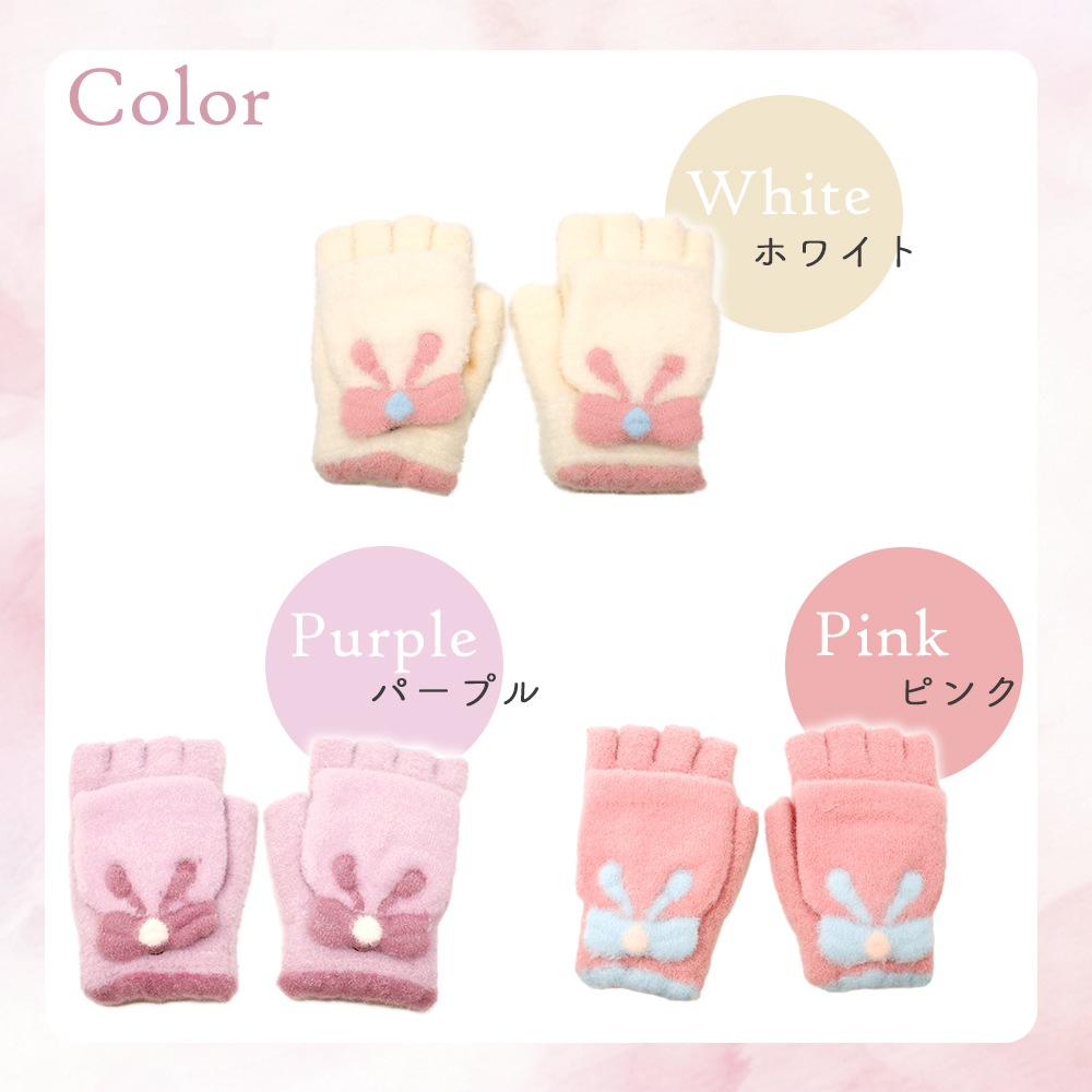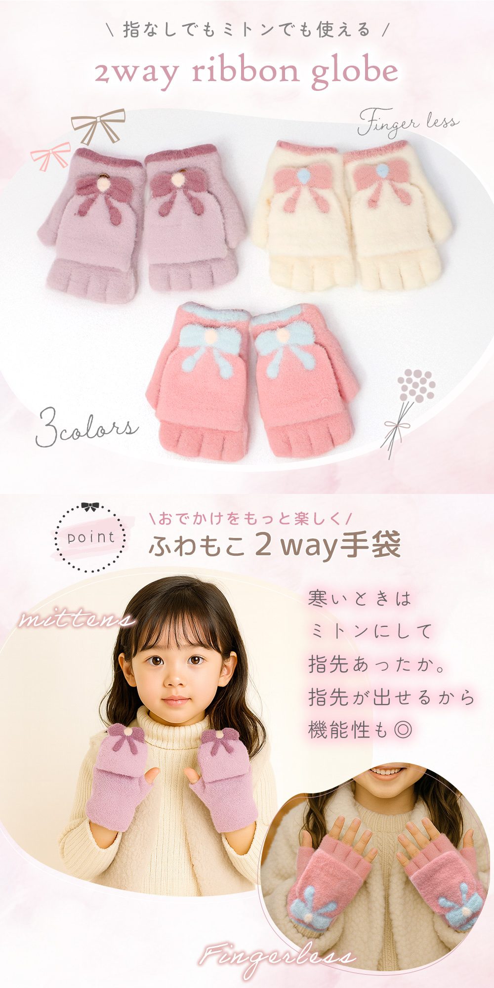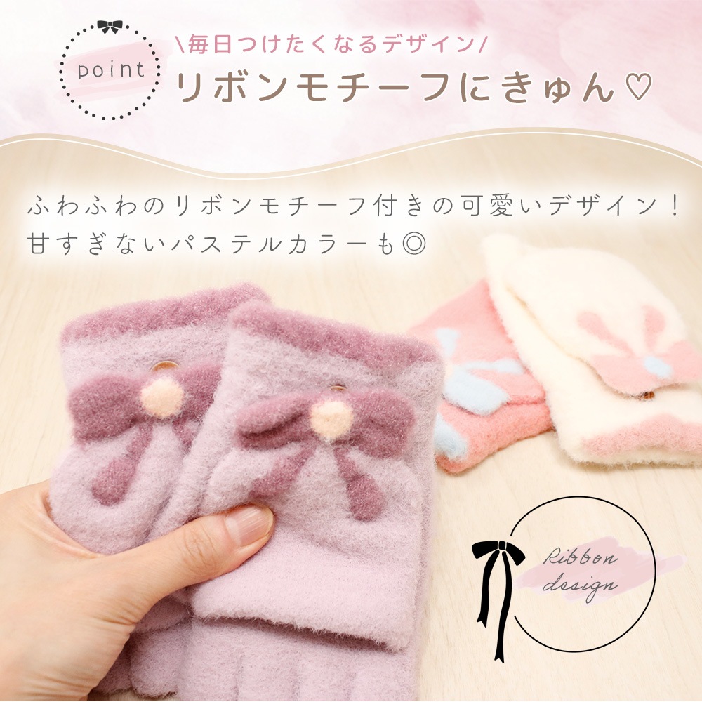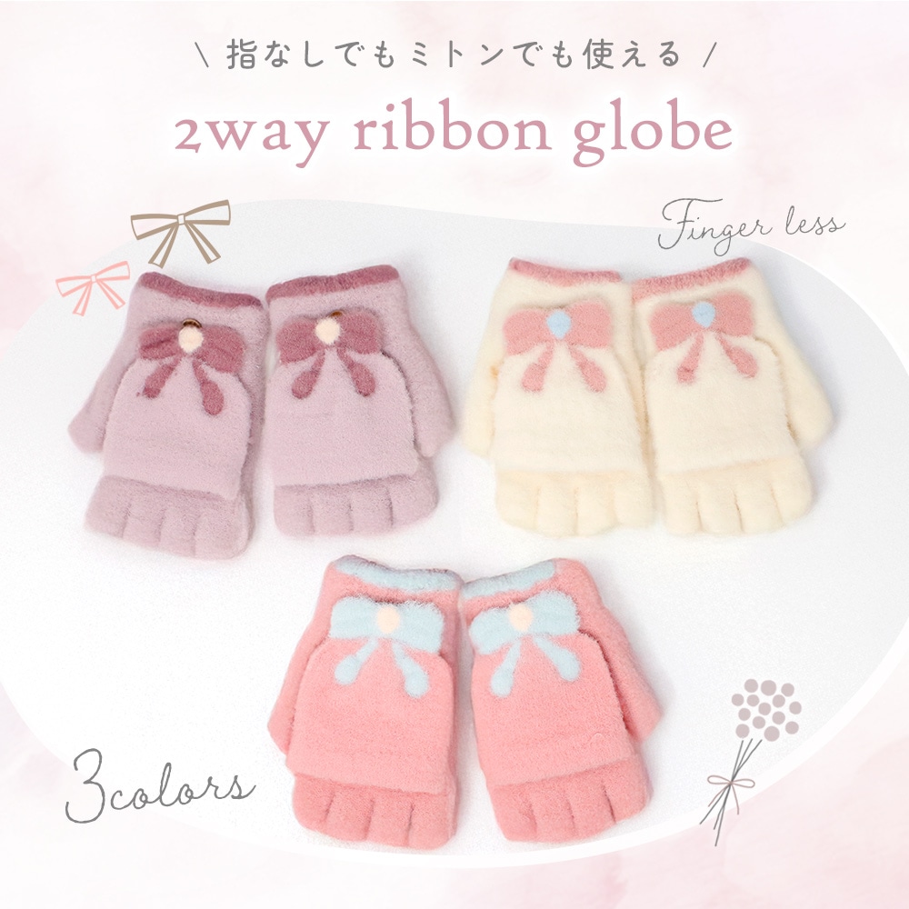 2wayリボン手袋 キッズ ジュニア 女の子 指なし ミトン 防寒 ふわもこ 起毛 通学 通園 小学校 外遊び 雪遊び スマホ操作 冬小物 てぶくろ プレゼント ギフト