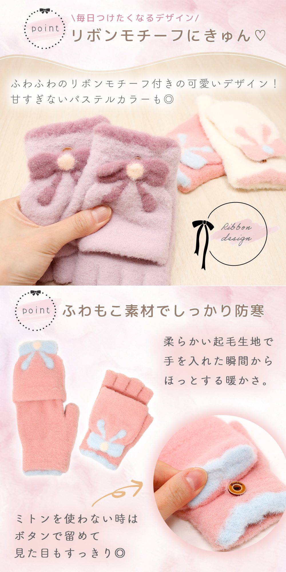 防寒性とおしゃれさを兼ね備えたリボン柄2way手袋で、冬のおでかけをもっと楽しく快適にしてくれます。