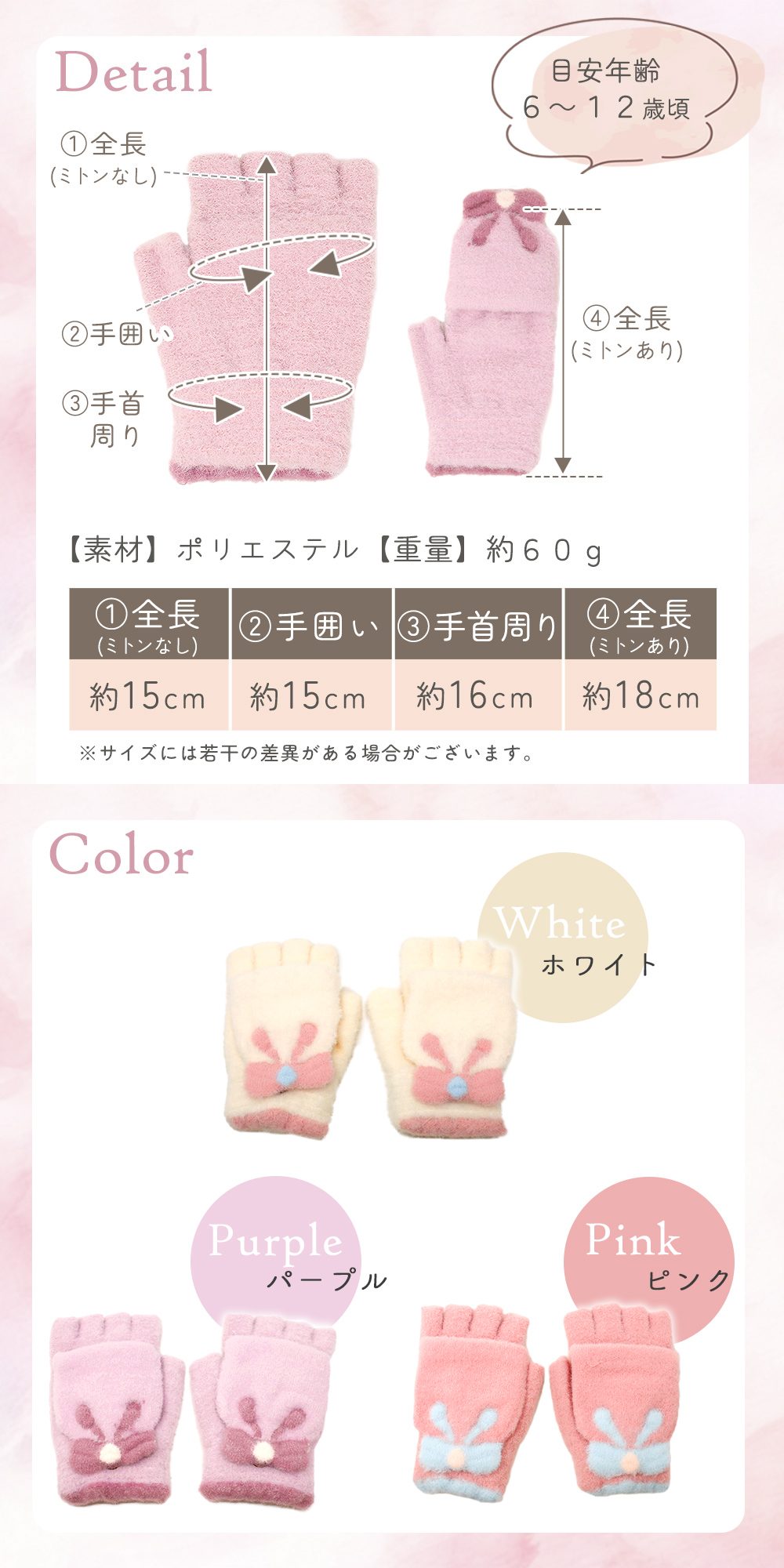手の甲にはリボン柄モチーフをあしらい、女の子が思わずときめくかわいいデザインに仕上げました。