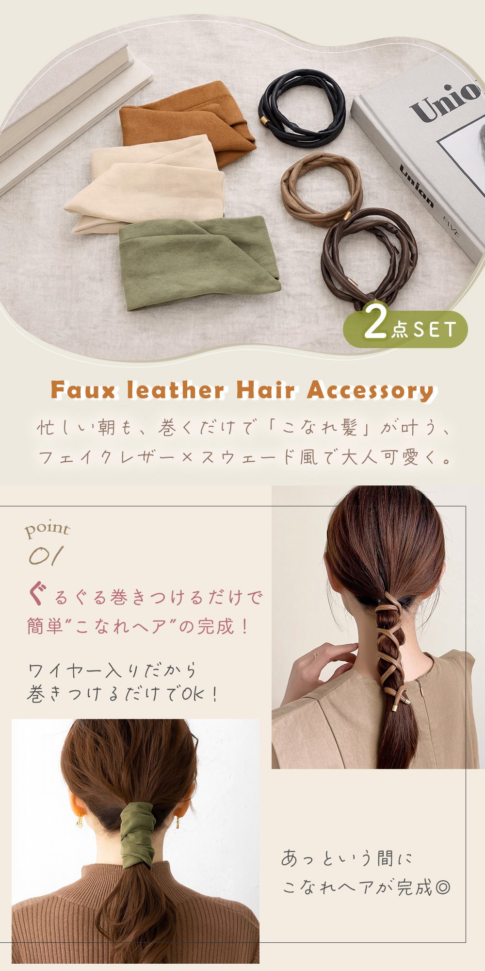 忙しい朝でも、ワイヤーポニーをぐるぐる巻きつけるだけで、こなれ髪が完成するヘアアクセサリの二点セットです。フェイクレザーのコードタイプとスウェード風の大きめヘアリボンを組み合わせて、シンプルなのに大人可愛いヘアアレンジが楽しめます。レディースの髪型を選ばず、ロングヘアもミディアムも、オフィスから休日コーデまで幅広く使えるおしゃれなアイテムです。