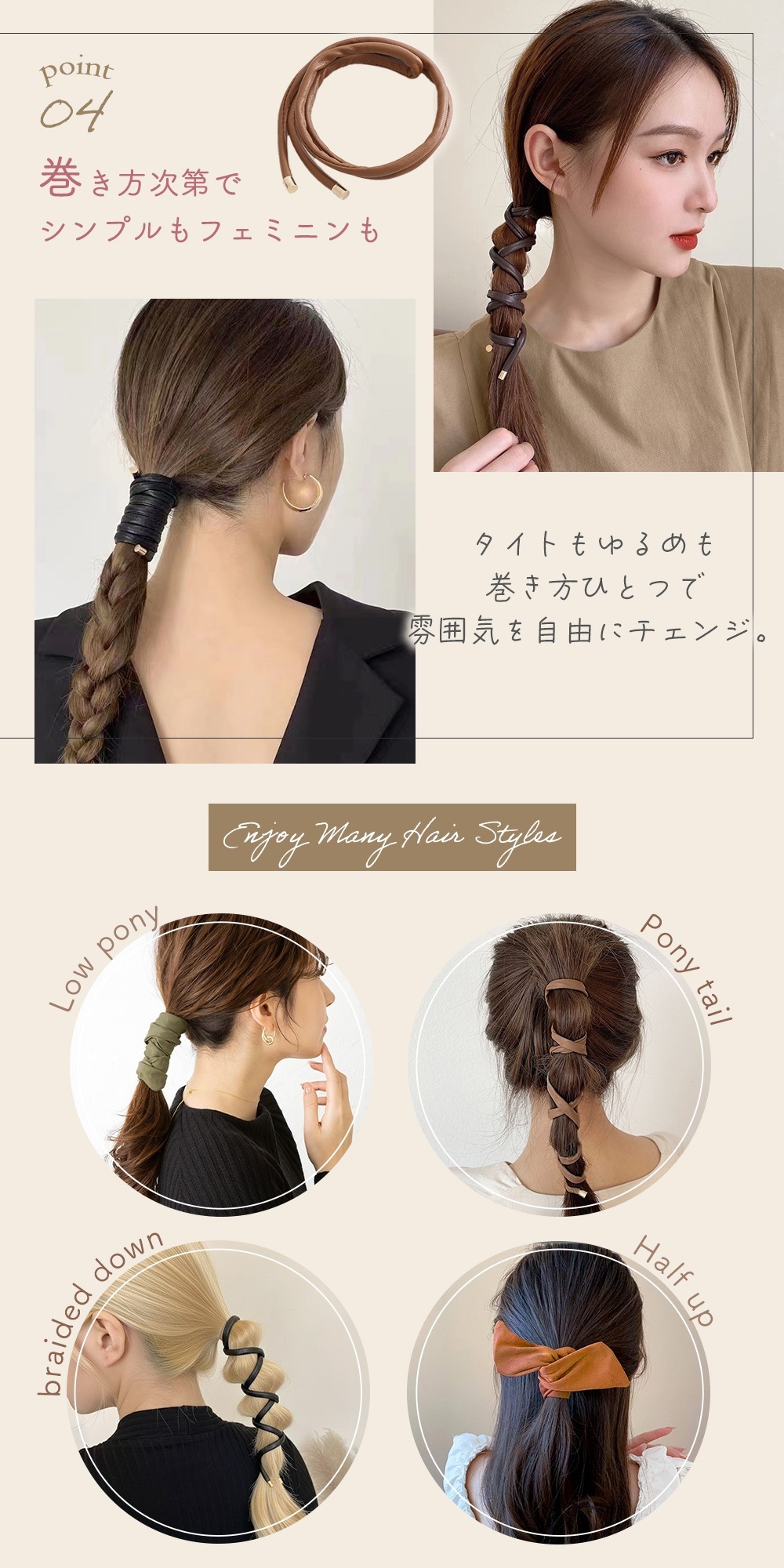 フェイクレザーのワイヤーポニーは、内部にワイヤー入りなので、ヘアゴムで結んだ髪にぐるぐるとコード巻きするだけでしっかり固定できます。弛まないフィット感で一日中崩れにくく、巻きつける強さを調整すれば、タイトなまとめ髪も、ゆるっとこなれヘアも自由自在。シンプルなコードデザインなので、リブニットやシャツワンピなど大人カジュアルなコーデにも、きれいめコーデにも自然になじみます。