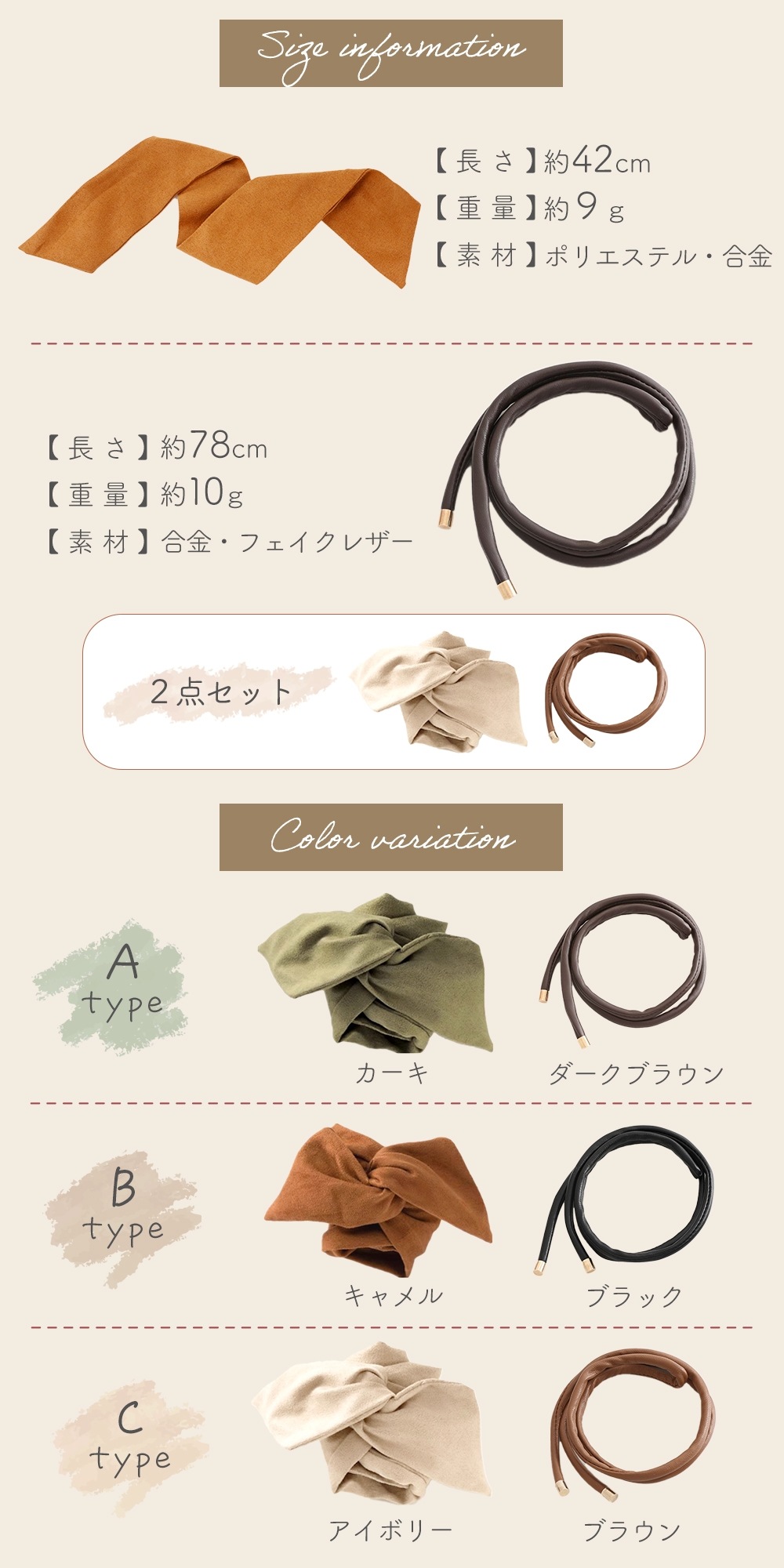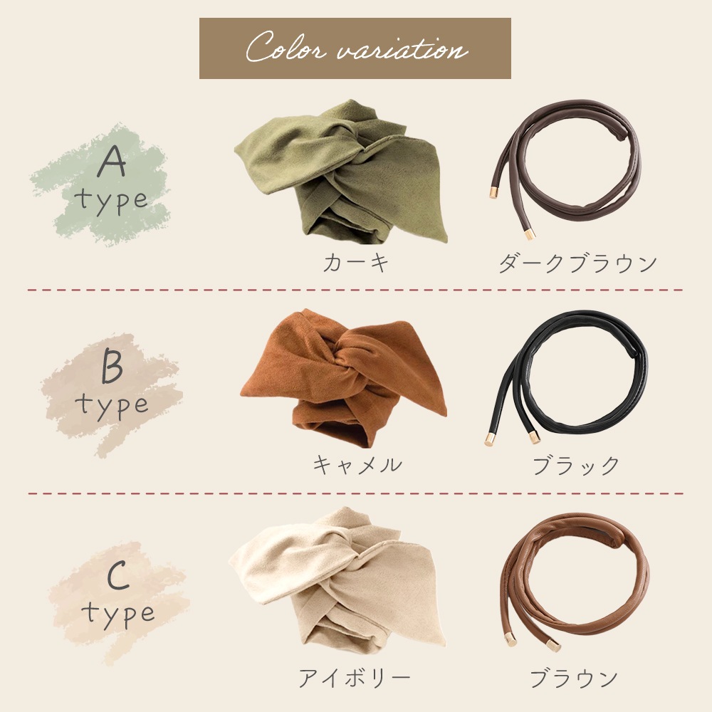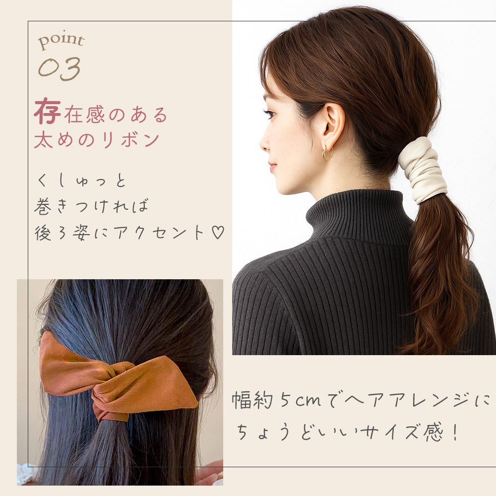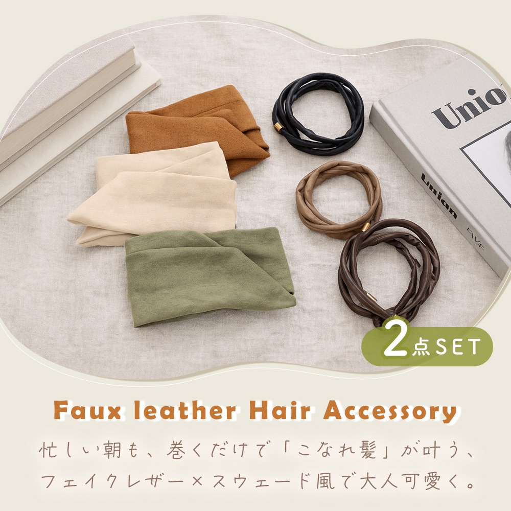 落ち着いたカラーのフェイクレザーと、やわらかな色味のスウェード風リボンは、大人カジュアルなスタイルにもきれいめコーデにも合わせやすい組み合わせです。ブラックやブラウンの定番色はもちろん、カーキやキャメルなどトレンド感のある色もそろっているので、その日のコーデや気分に合わせて使い分けが可能。一本あるだけでヘアアレンジが楽しくなる、レディース向けのヘアアクセサリです。
