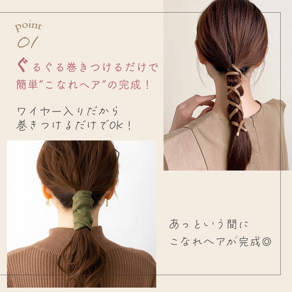 ローポニーにぐるぐる巻きつけたり、三つ編みに沿ってコード巻きしたり、まとめ髪の根元を隠すように巻いたりと、ワイヤーポニーならアレンジのバリエーションが豊富です。忙しい朝も時間をかけずに、こなれ髪と大人可愛い後ろ姿を演出できます。シンプルなのにきちんと感のあるデザインなので、ちょっとしたお出かけや通勤・通学にもぴったりのヘアアクセサリです。