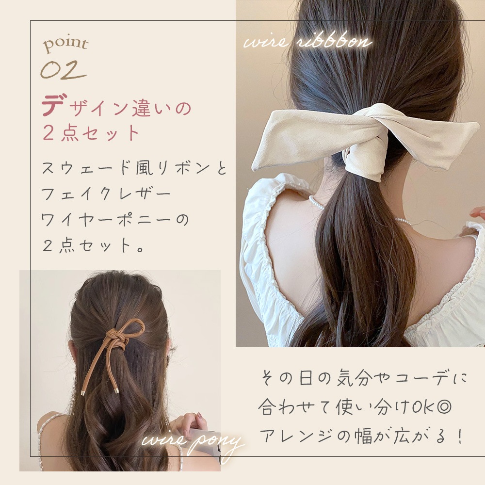 ワイヤーポニー 2個セット スウェード風 リボン 大きめ ヘアアクセサリ フェイクレザー ワイヤー入り こなれヘア 大人カジュアル シンプル コーデ きれいめ