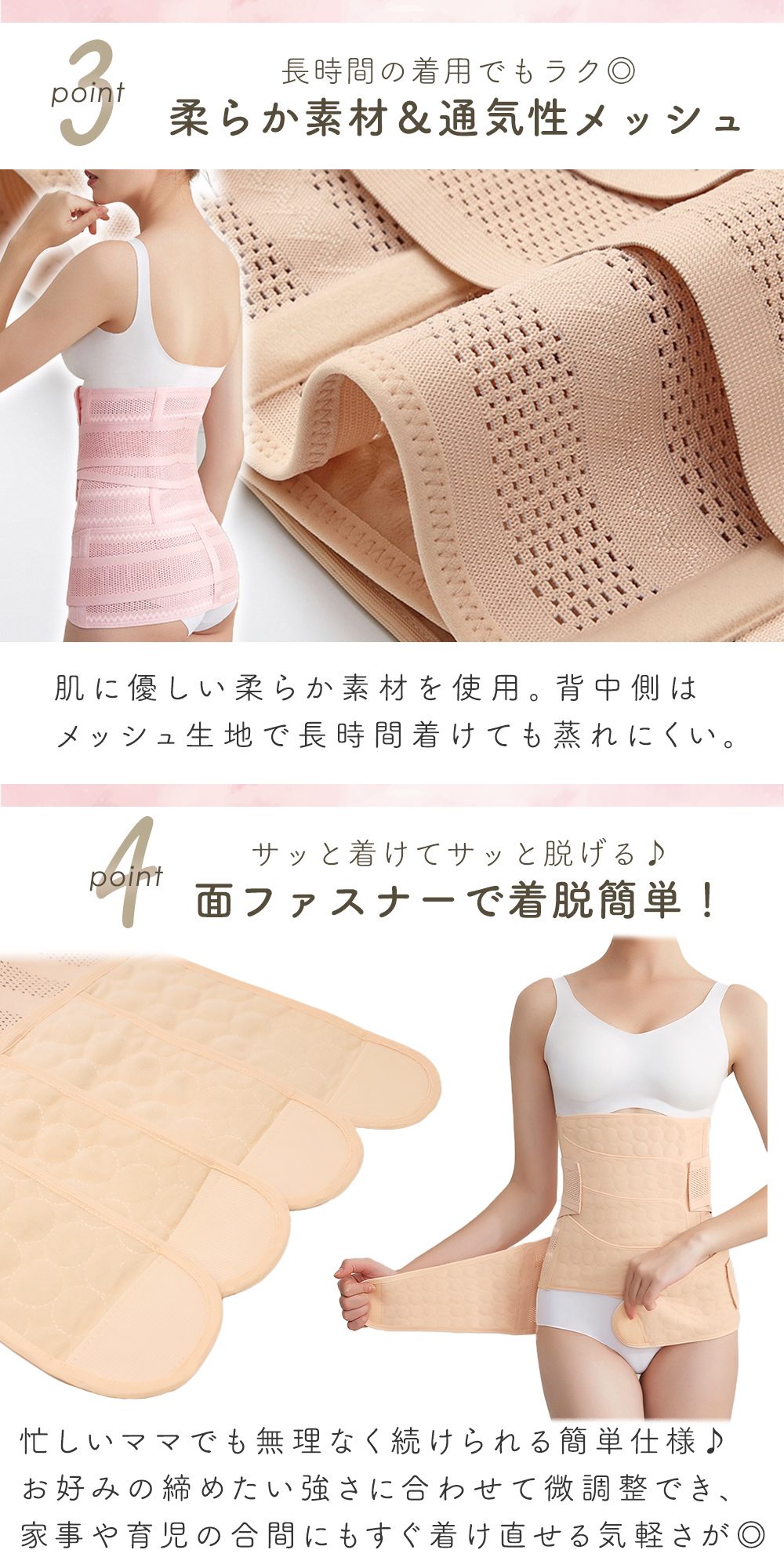 肌あたりの良い柔らか素材を使用し、背中側には通気性の高いメッシュ生地を採用。長時間着けていてもムレにくく、季節を問わず快適に使えるのが魅力です。伸縮性のある生地が体の動きに合わせてフィットするので、家事や育児、デスクワーク中でも動きやすく、補正下着特有の窮屈さを感じにくい設計。ウエストラインとボディラインを整えながら、無理のない着圧で美シルエットをキープします。