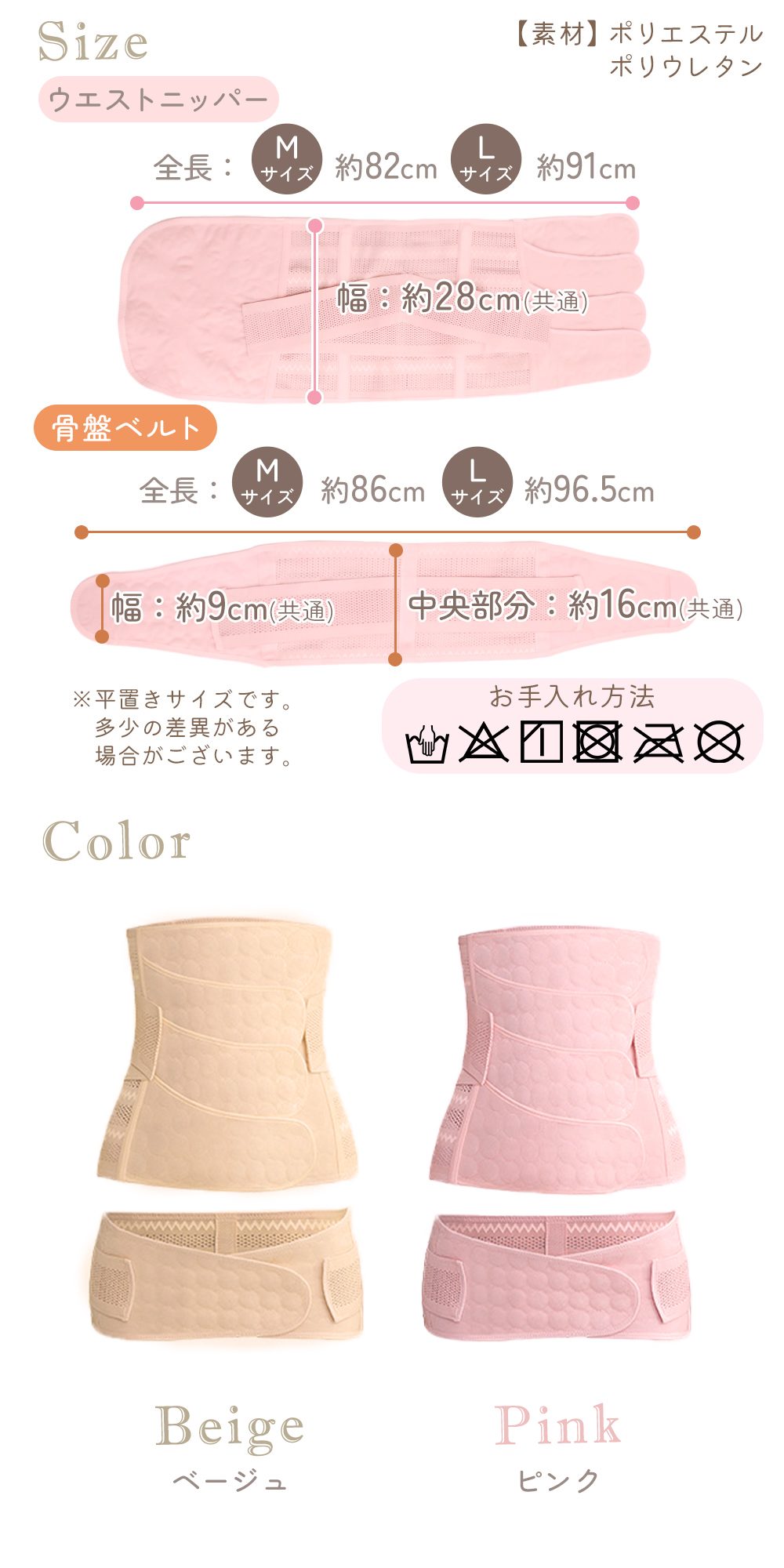 産後のぽっこりお腹やゆるんだウエストライン、骨盤のぐらつきが気になる方にうれしい、ウエストニッパーと骨盤ベルトの補正下着2点セットです。ボディラインを整えながら、骨盤まわりを安定させて姿勢や歪み矯正をサポート。レディース用として、産後ケアはもちろん、妊婦さんや立ち仕事・座り仕事が多い方の腰痛対策サポーターとしても活躍します。ピンクとベージュのやさしいカラーで、普段着の下に着ても目立たないデザインです。