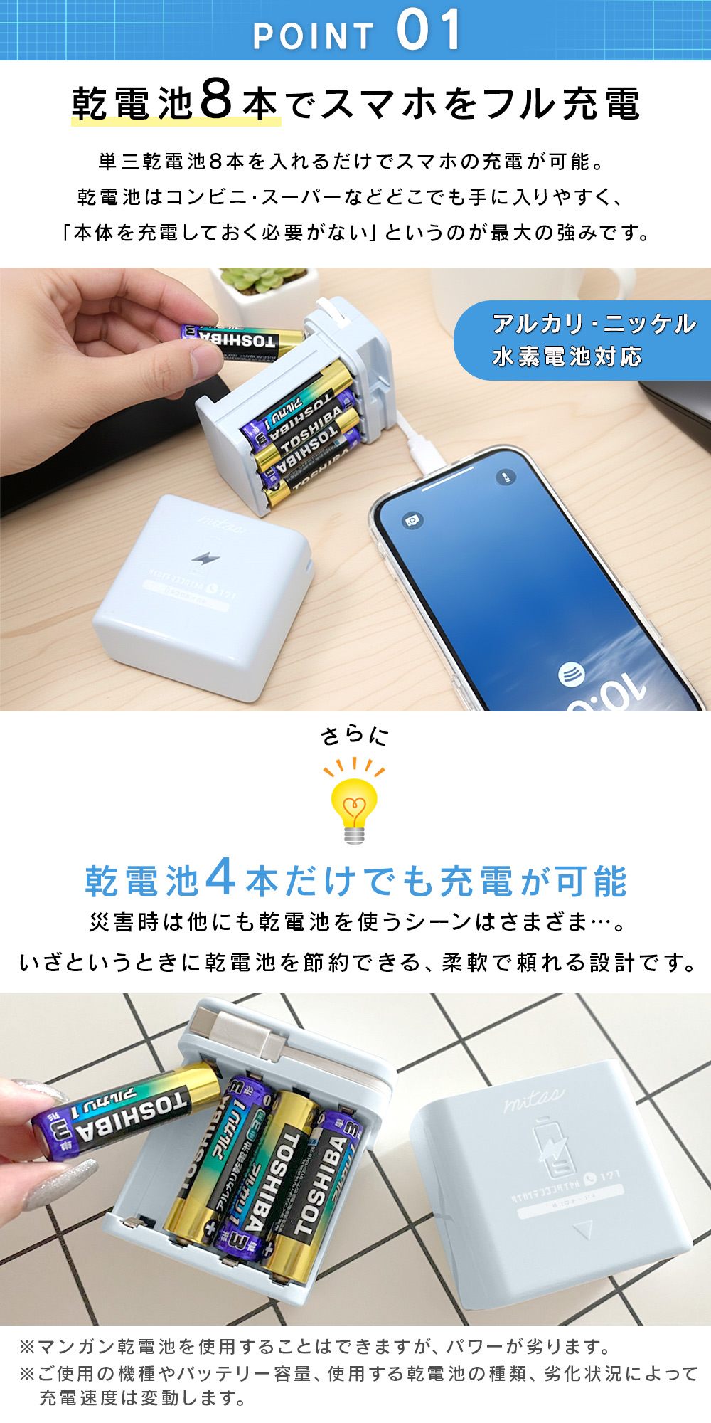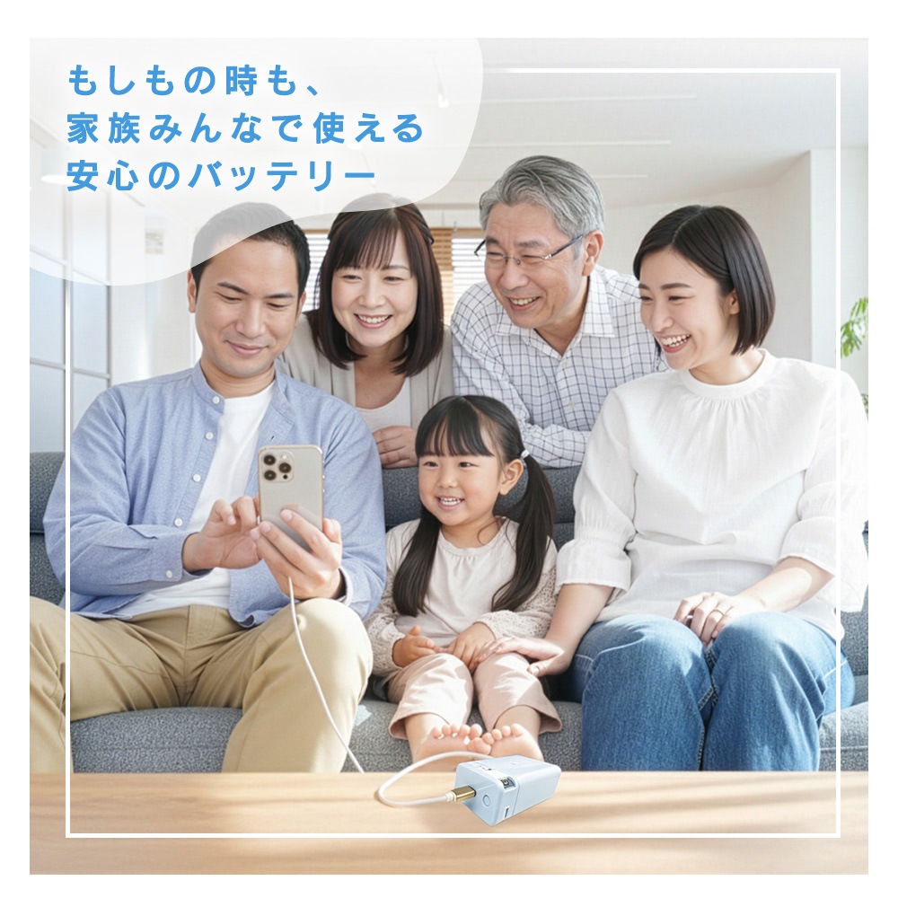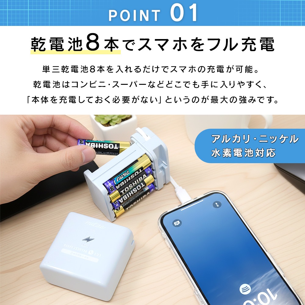 単三電池八本をセットするだけでスマホを一回分フル充電できます。約三時間で満充電できるため、停電や災害時の非常用としても最適です。四本でも充電ができる柔軟設計で、手持ちの電池が少ない場面でも安心して使えます。防災リュックに常備しておくと、地震や停電などの緊急時にも心強いアイテムです。