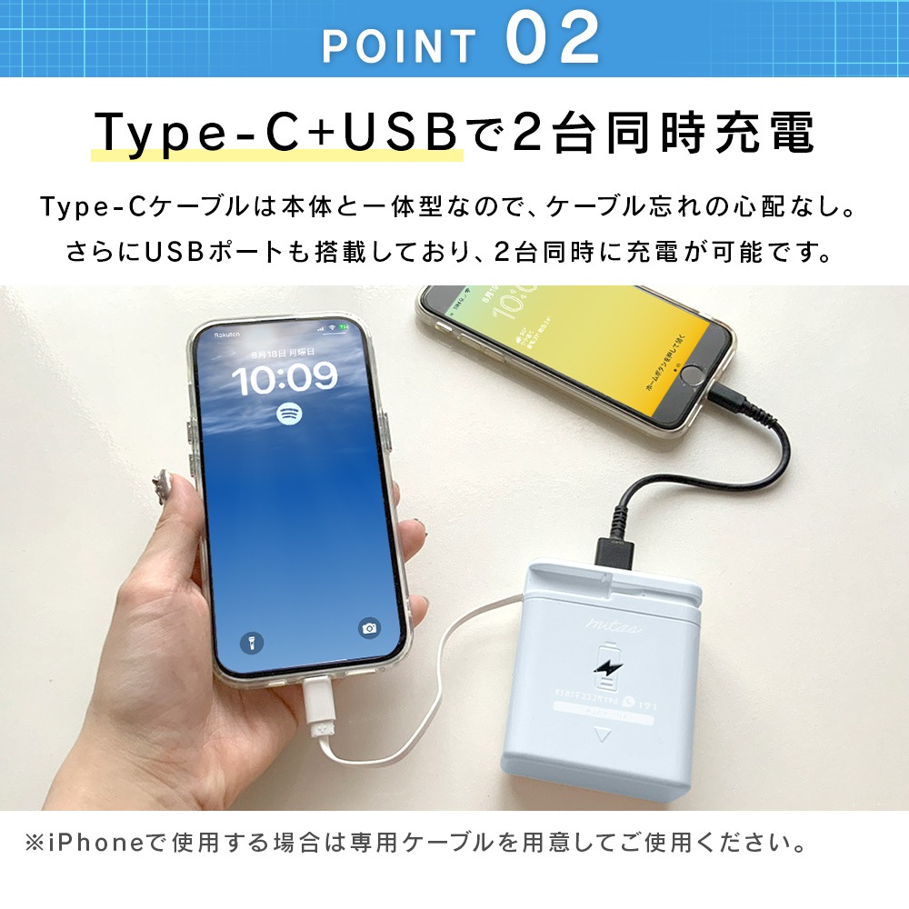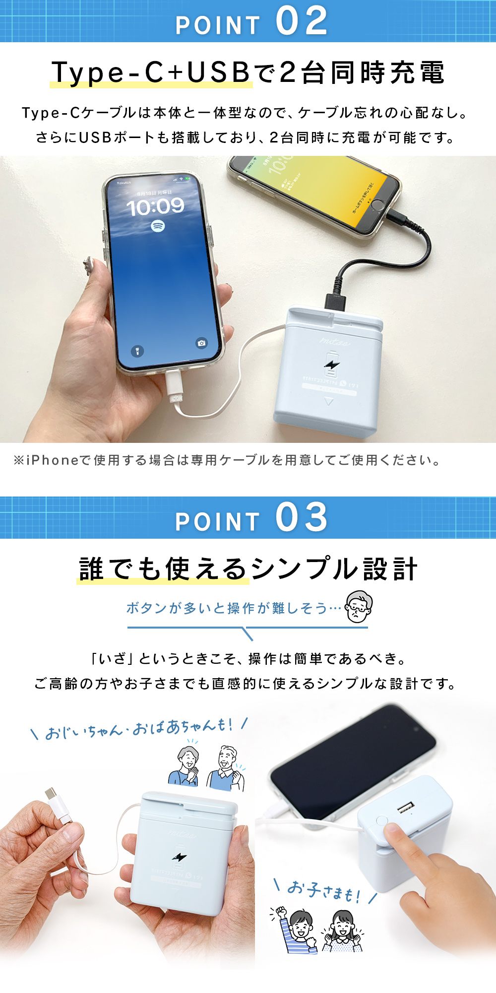 Type-CケーブルとUSBポートを搭載し、スマホやAndroidスマートフォンなど二台同時充電が可能です。Lightningケーブルを使用すればiPhoneにも対応。ケーブル一体型で持ち運びもラクラクで、自宅からアウトドアまで幅広く活躍します。