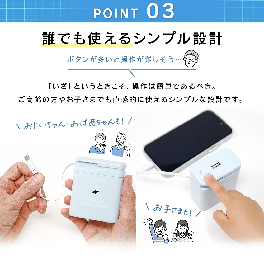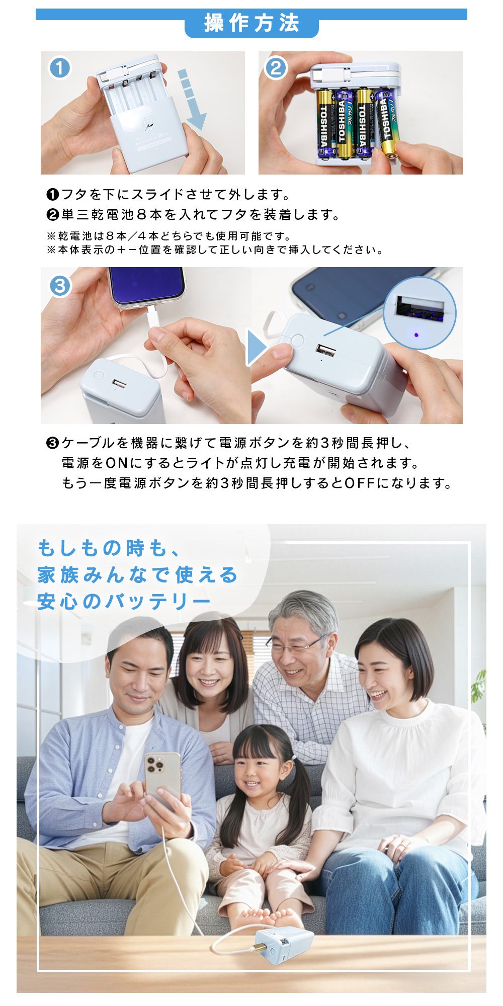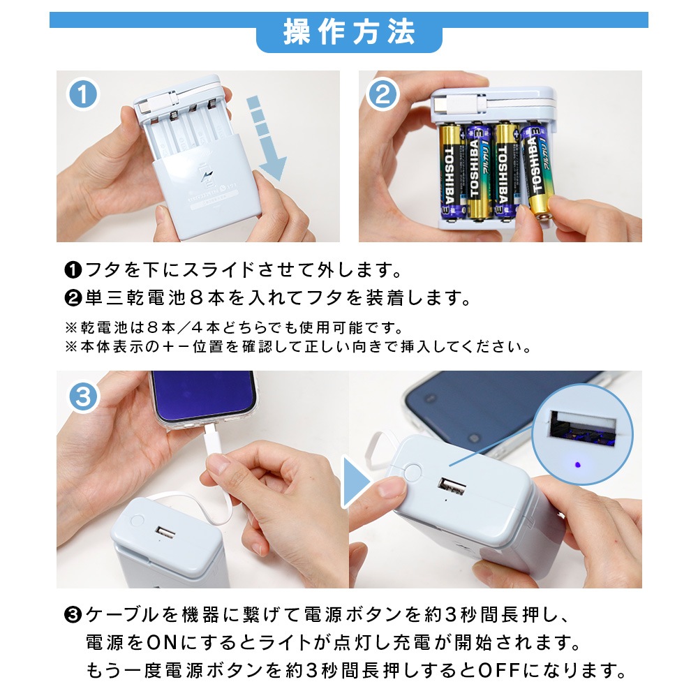 乾電池をセットして電源ボタンを長押しするだけですぐに充電が開始。操作が分かりやすいシンプル設計なので、ご高齢の方やお子さまでも安心して使えます。軽量で小型のため普段の持ち歩きにも便利です。