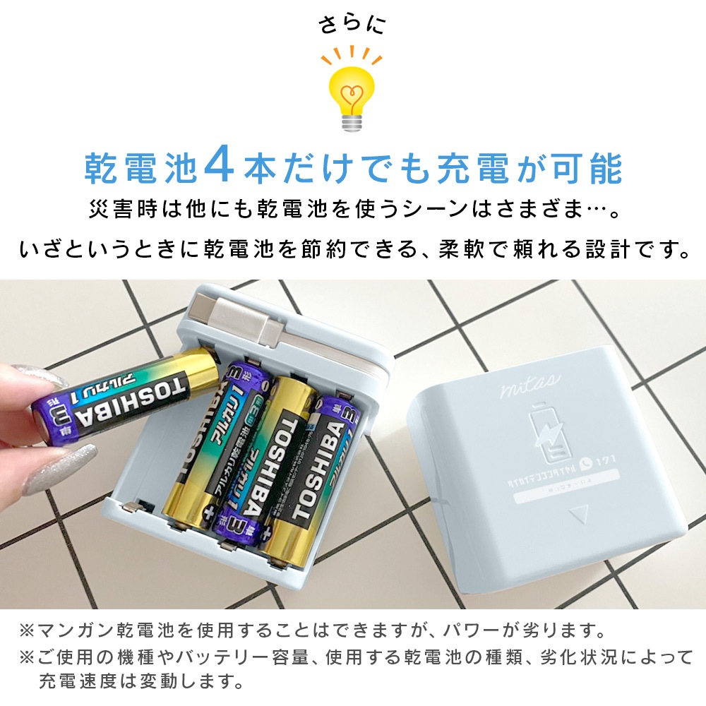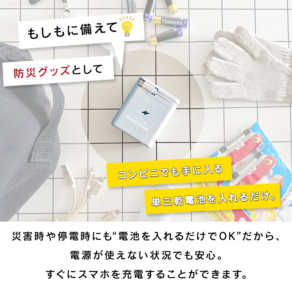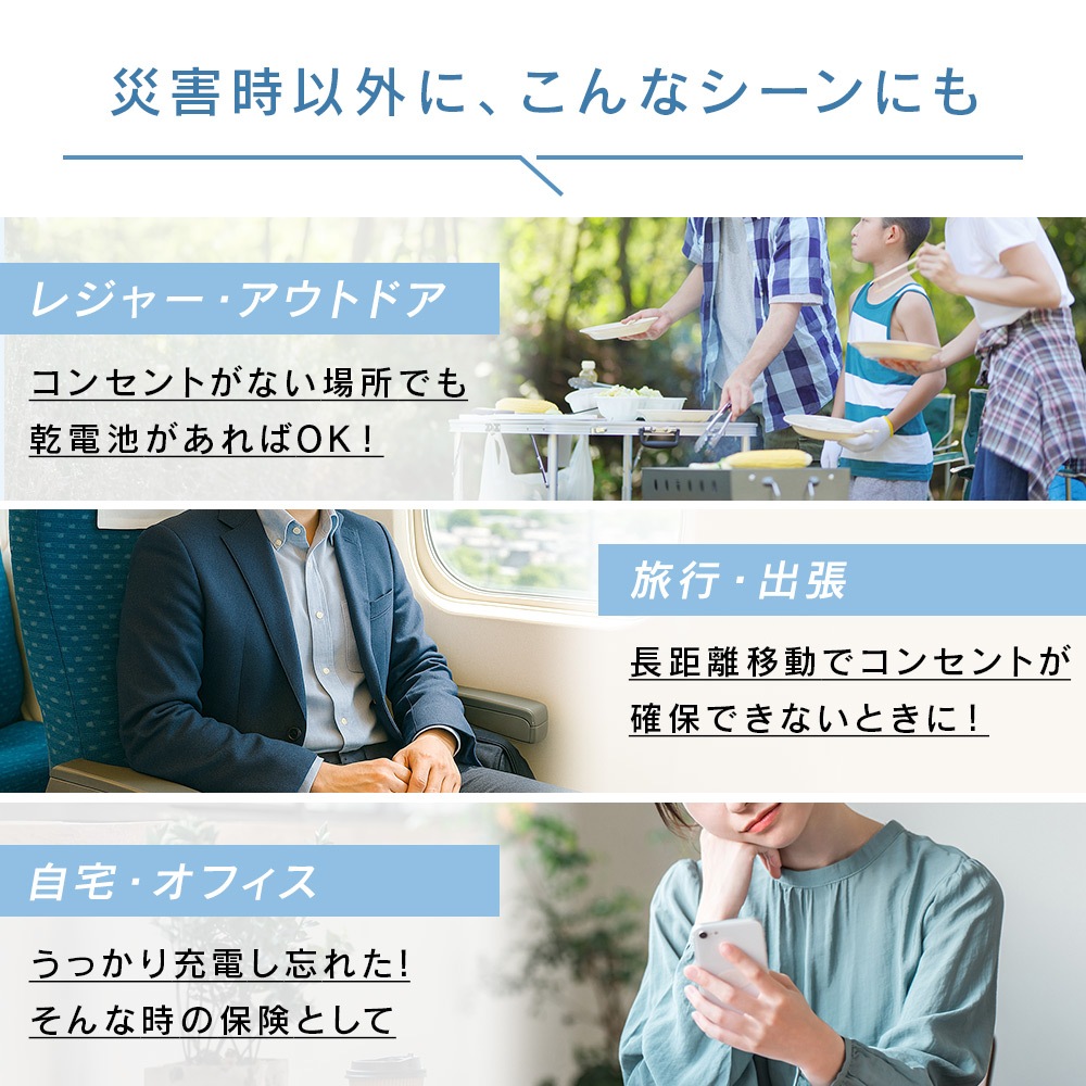 電源が確保できない停電時や災害時でも、乾電池があればスマホを充電できます。電池はコンビニやスーパーで入手しやすいため、非常時でも確実に調達しやすいメリットがあります。非常用持ち出し袋に入れておきたいアイテムです。