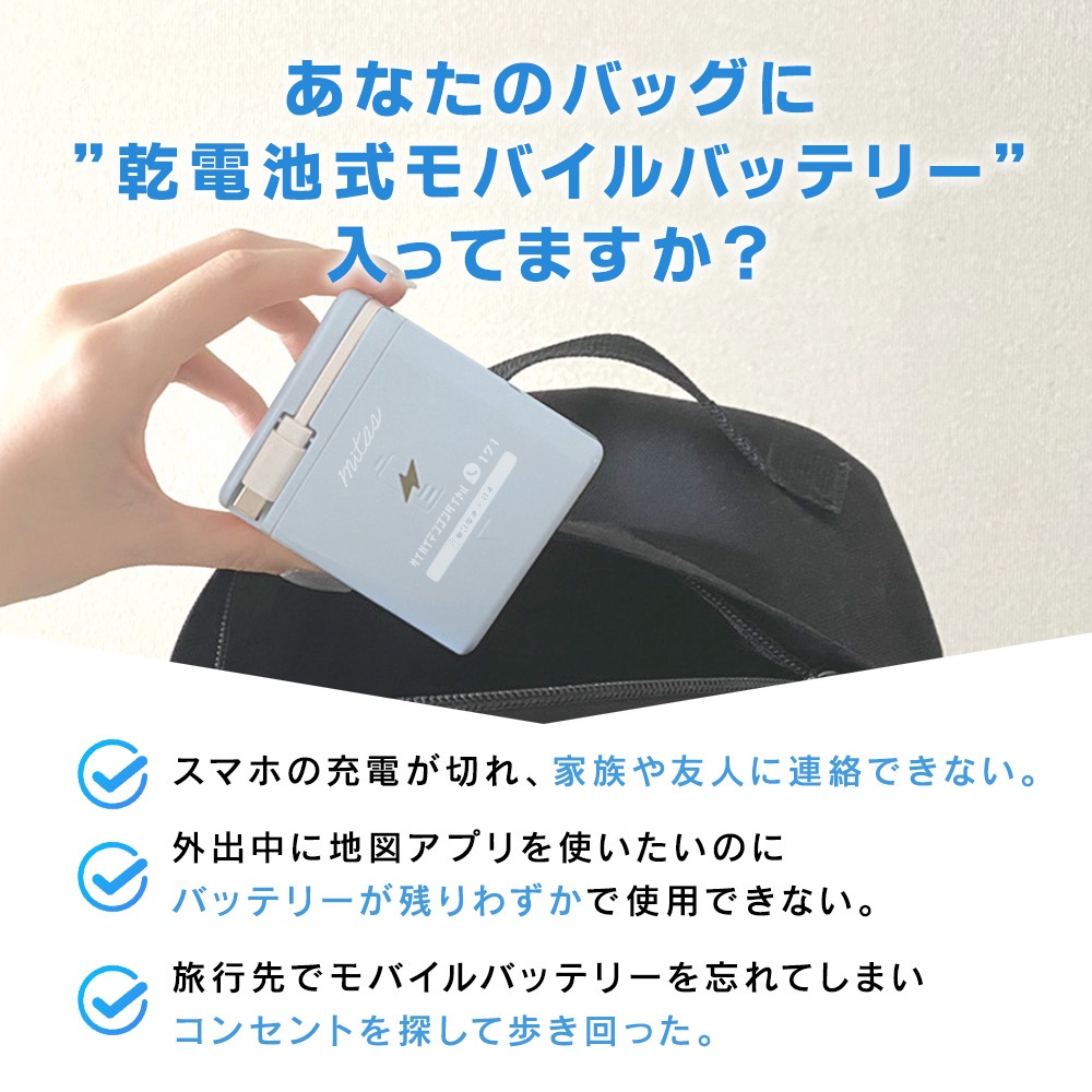 外出時にスマホの充電が切れてしまった時、本体の充電を忘れていて使えなかったという経験はありませんか。乾電池式モバイルバッテリーなら単三電池を入れるだけで充電でき、電源がない場所でも安心です。コンビニで手に入る乾電池を使用できるため、旅行や出張、アウトドア、防災グッズとして非常に便利です。くすみカラーのおしゃれなデザインで、Type-Cケーブル一体型の持ち運びしやすい構造もポイントです。