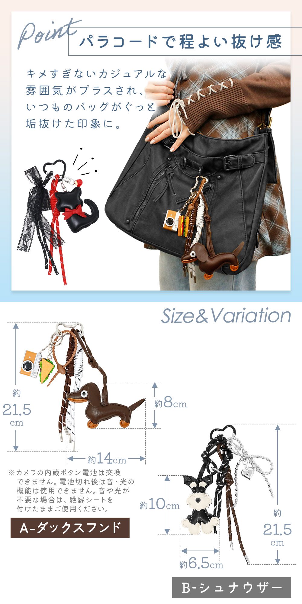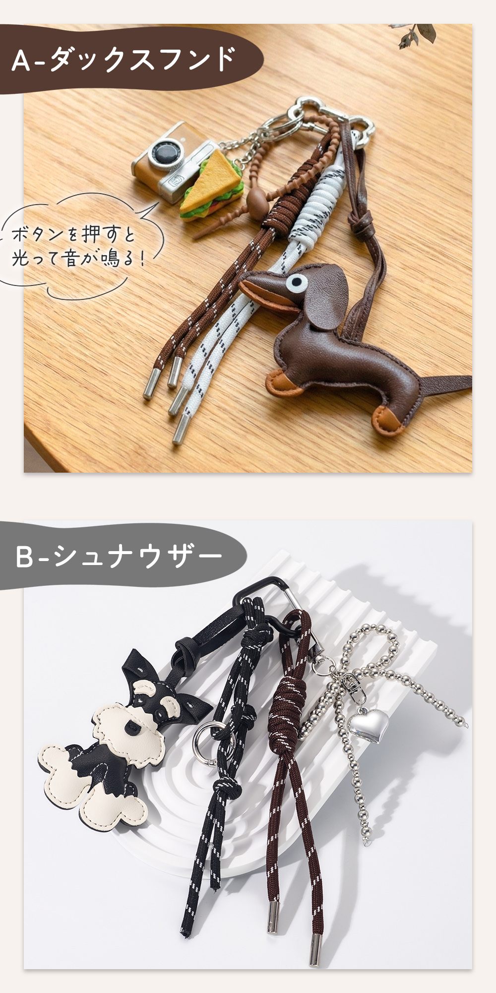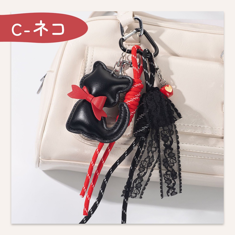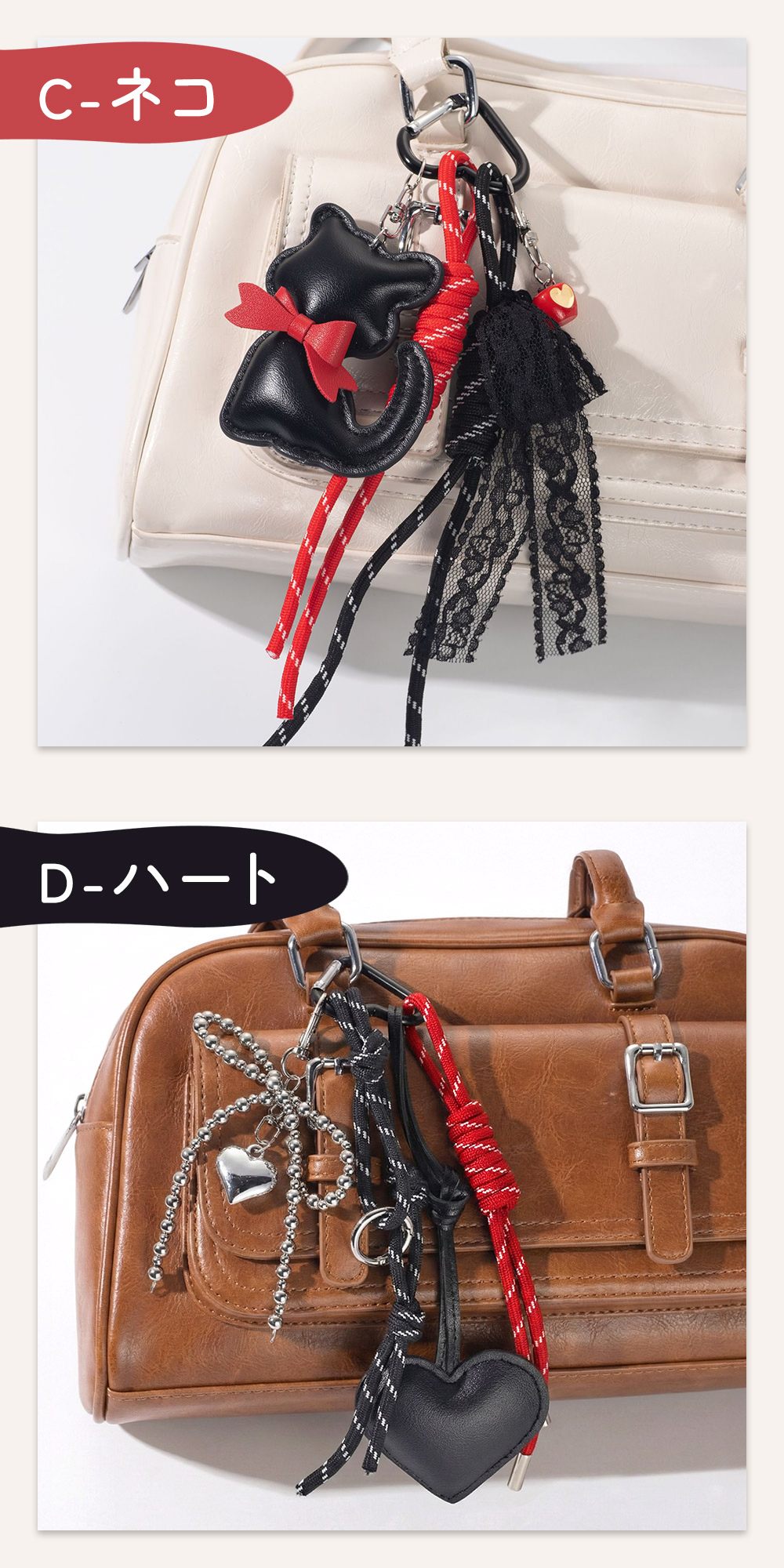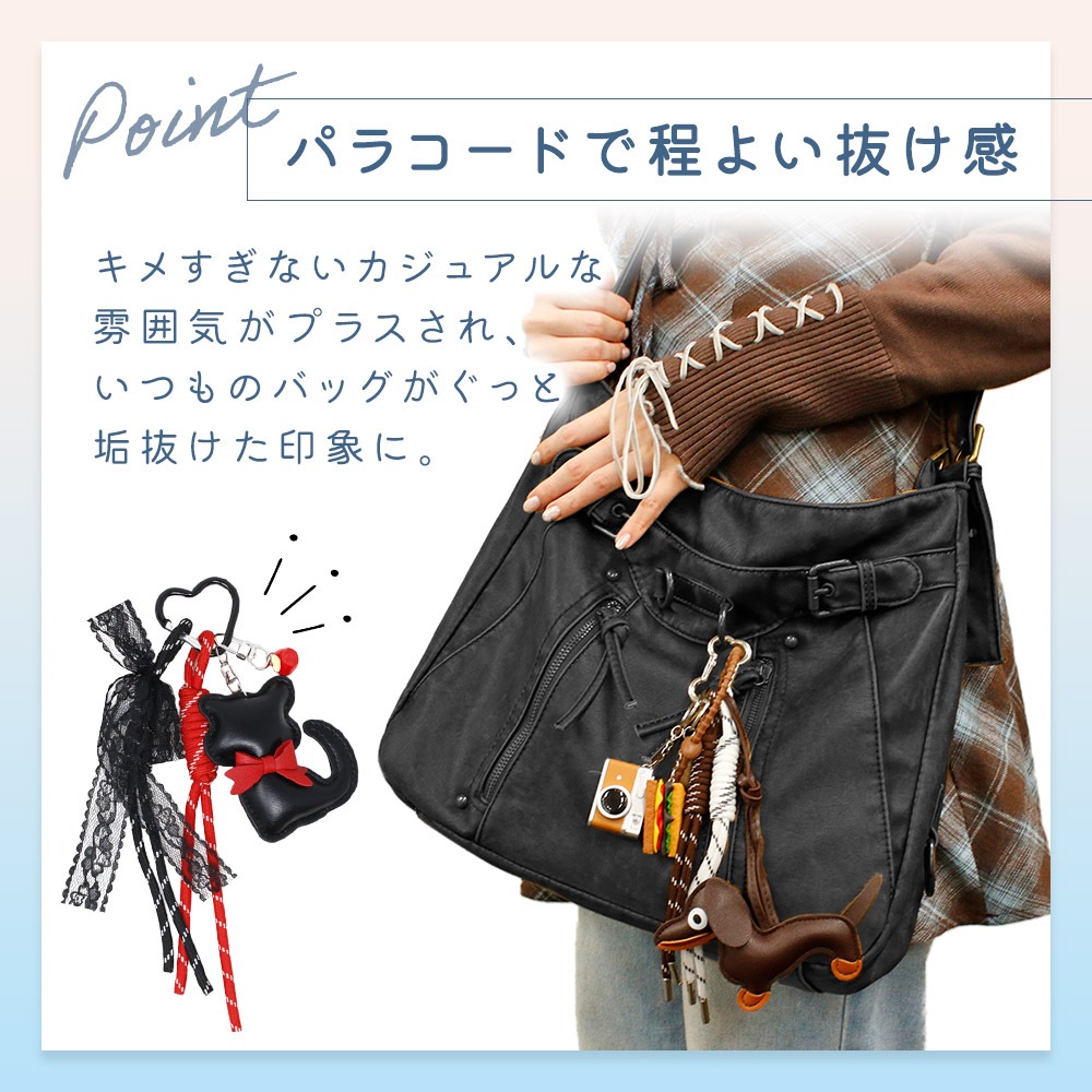 パラコードとチャーム、立体マスコットを組み合わせた、にぎやかなバッグチャーム。シンプルなバッグやストラップに付けるだけで、コーデのアクセントになり、重ね付けでも存在感たっぷりです。じゃらじゃら揺れる動きが、カジュアルにもきれいめにも程よくなじみます。