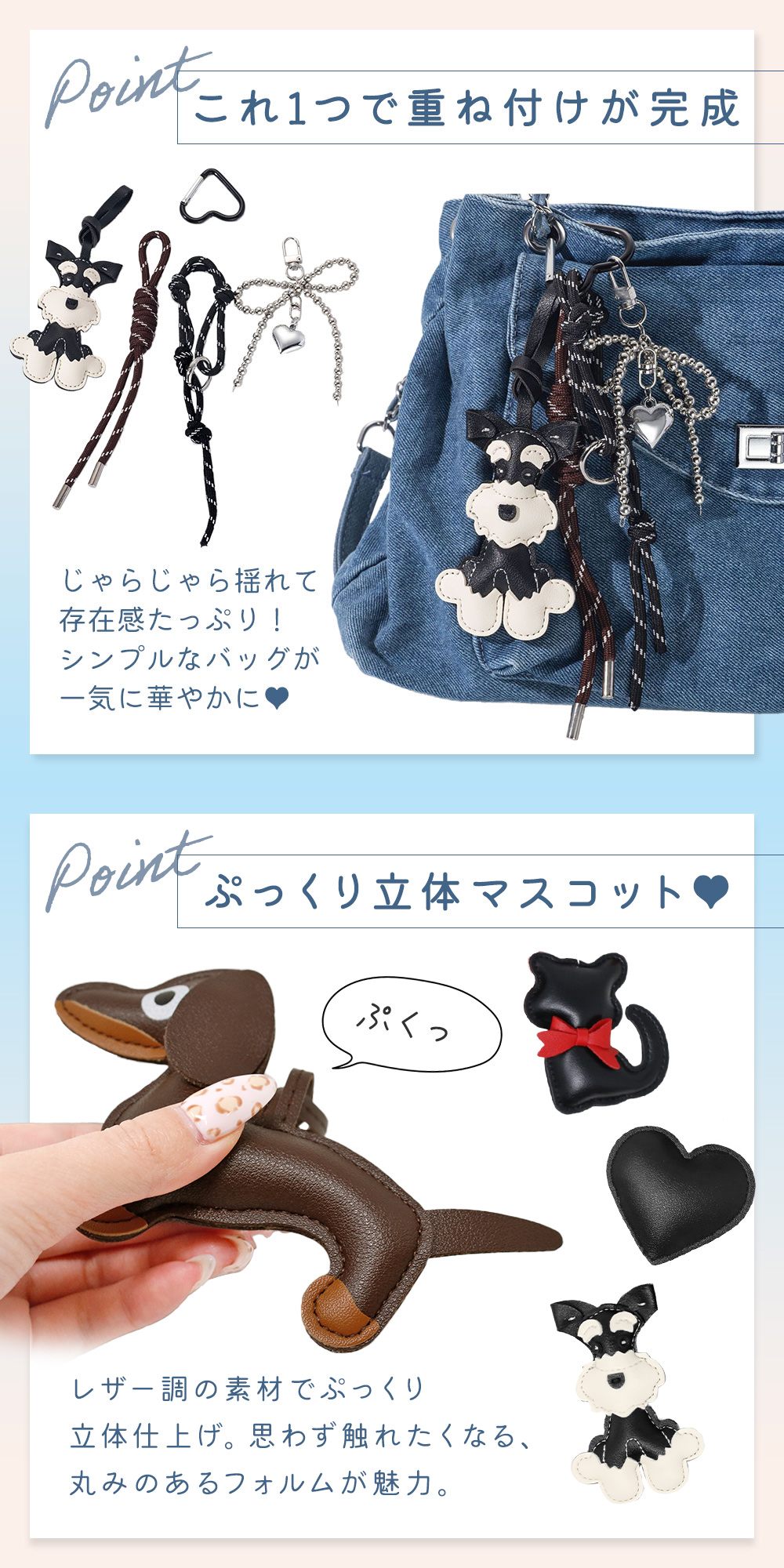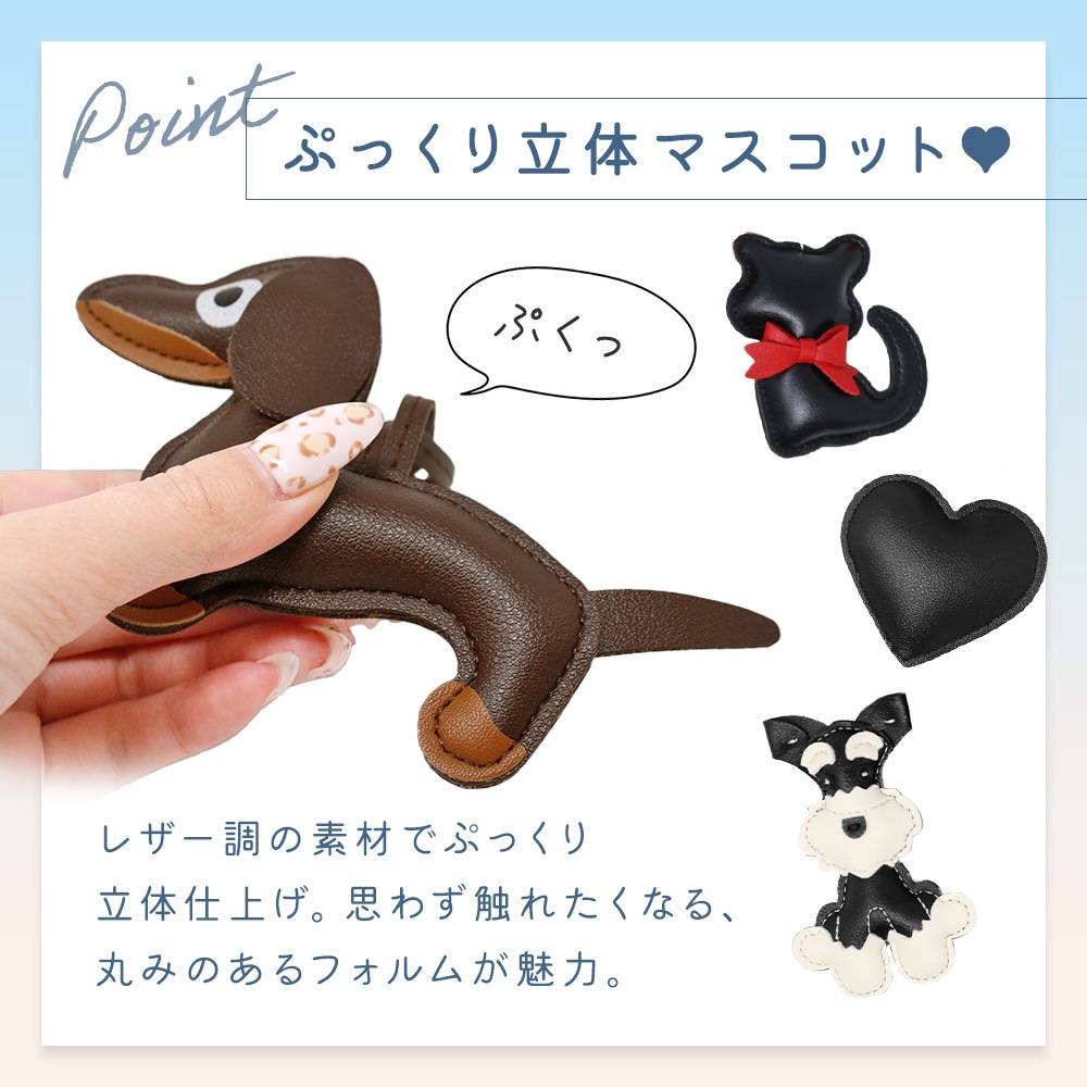 レザー調のぷっくりフォルムが魅力。柔らかい印象の立体デザインで、触れたくなる質感に仕上げました。ダックスフンド、シュナウザー、ネコ、ハートのモチーフは、かわいいのに甘すぎず、おしゃれに使えるレディース小物としておすすめです。