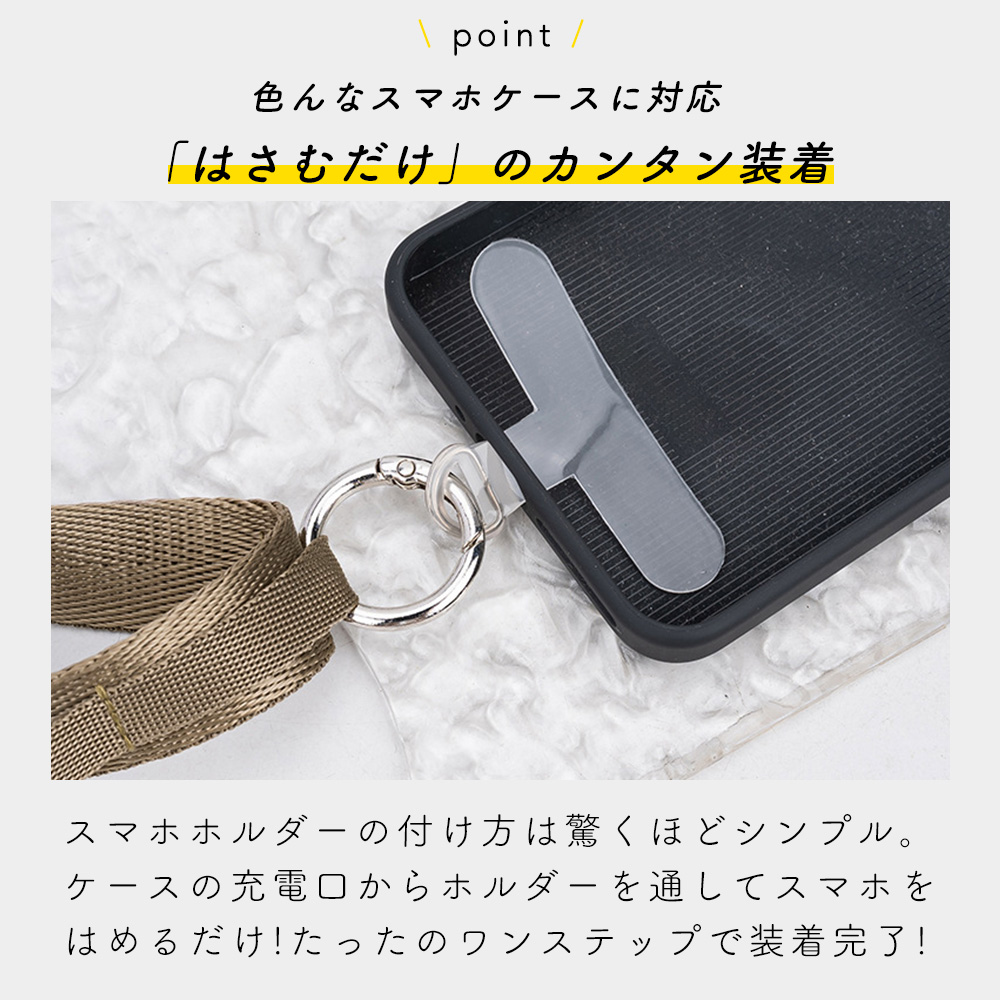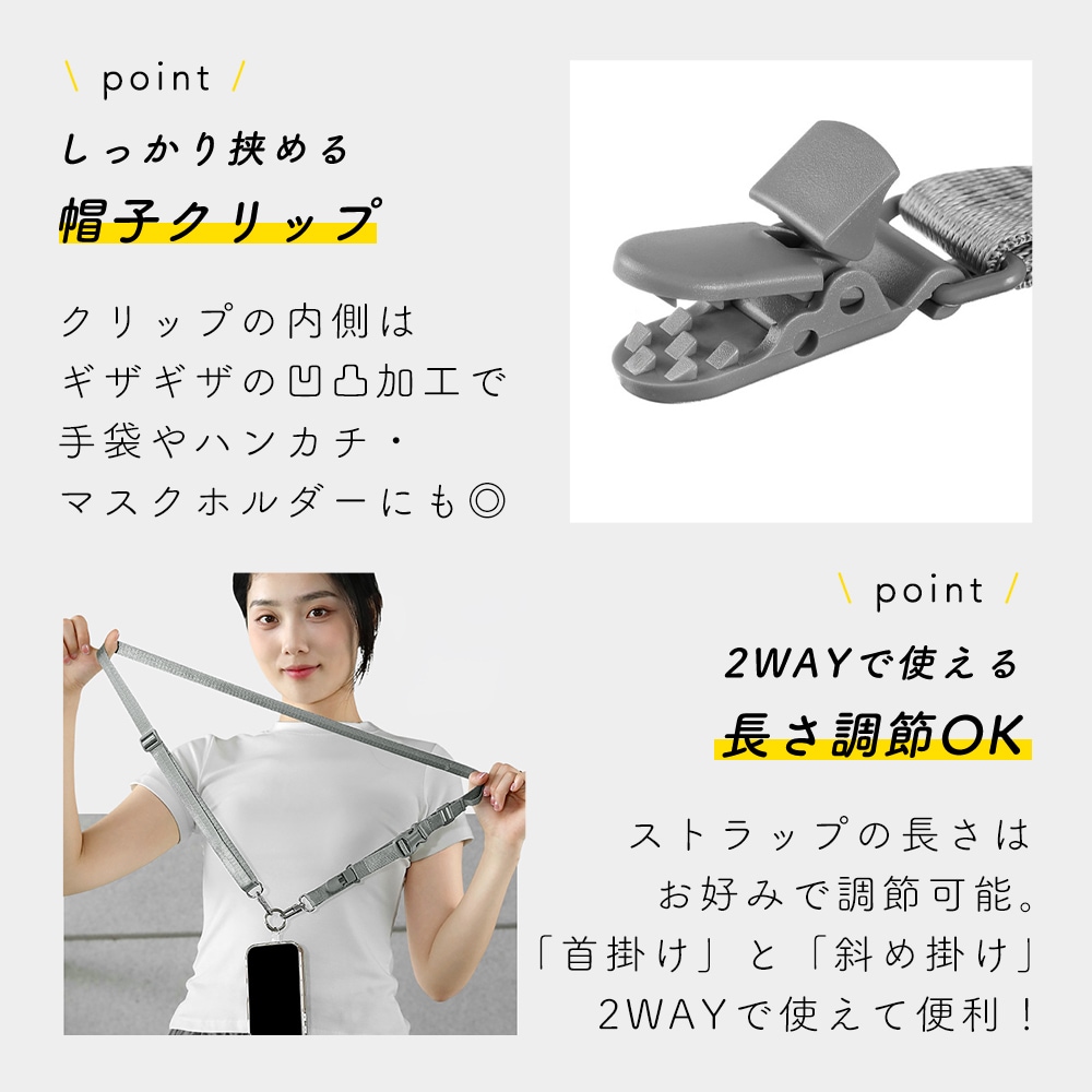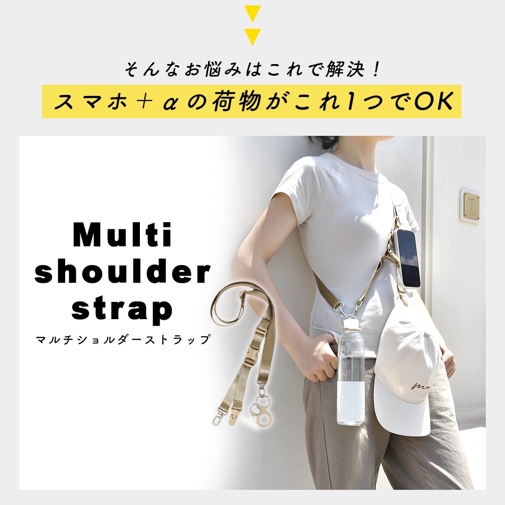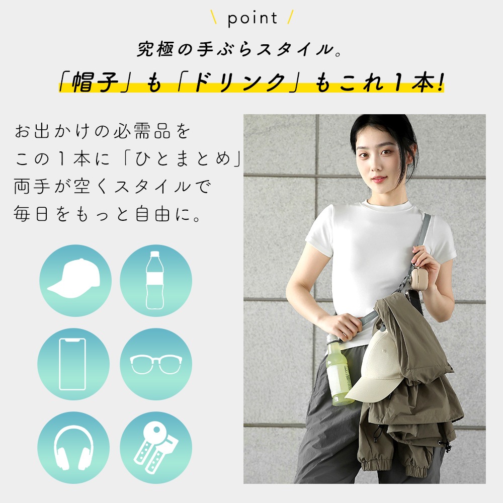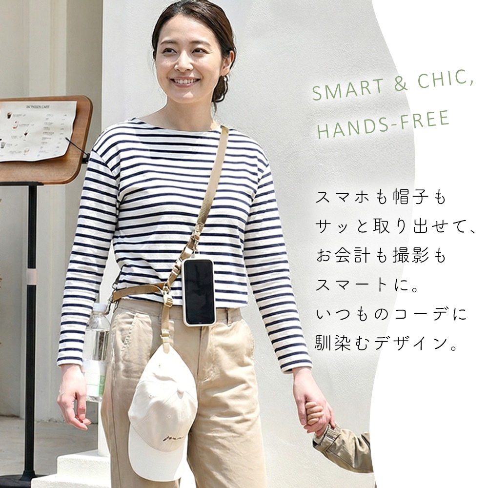 スマホやドリンク、帽子など外出時に増えがちな小物をまとめて持ち運べるマルチショルダーストラップ。手に持つ荷物を減らすことで、移動中のストレスを抑え、外出やアウトドアをより快適に楽しめます。普段使いはもちろん、旅行やキャンプ、フェスなどアクティブなシーンにも活躍します。