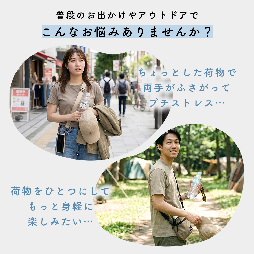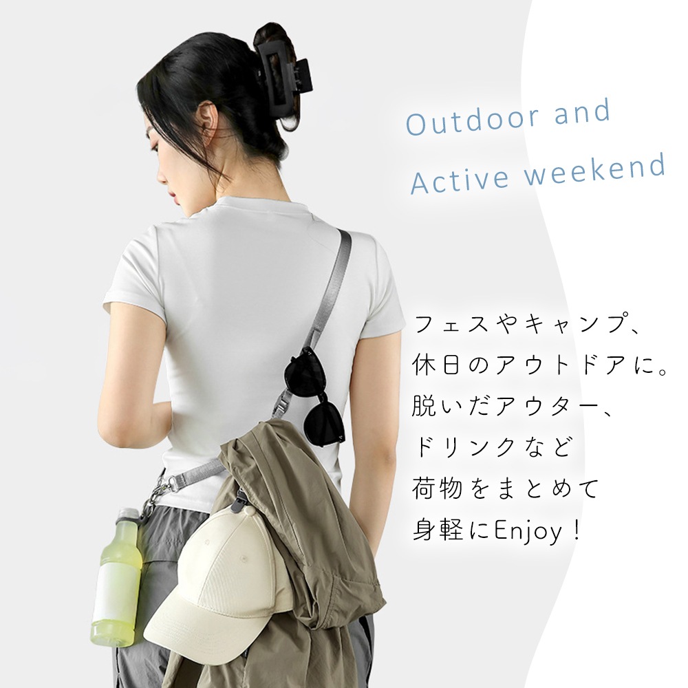 普段の外出はもちろん、キャンプや旅行、イベントなど荷物を最小限にしたい場面で活躍。実用性とデザイン性を両立したショルダーストラップは、毎日の外出をより快適でスマートな時間へと導きます。