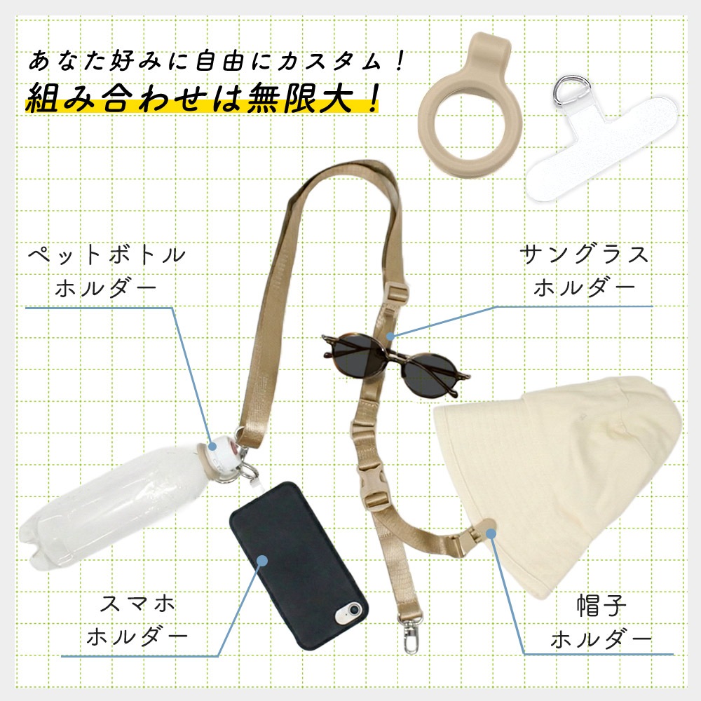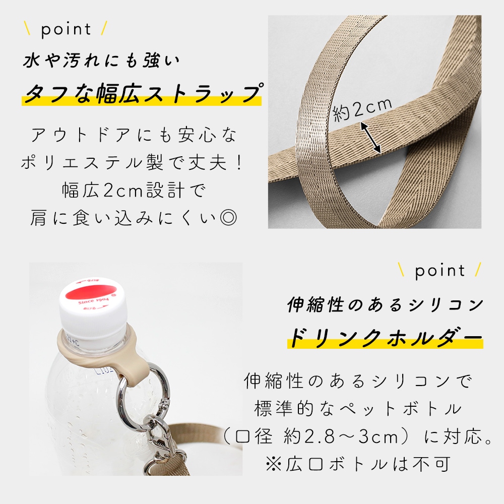 マルチショルダーストラップ 手ぶら 外出 手荷物 ペットボトル スマホ 帽子 鍵 ドリンクホルダー 首掛け 斜め掛け 2way 長さ調節 キャンプ おしゃれ 太め