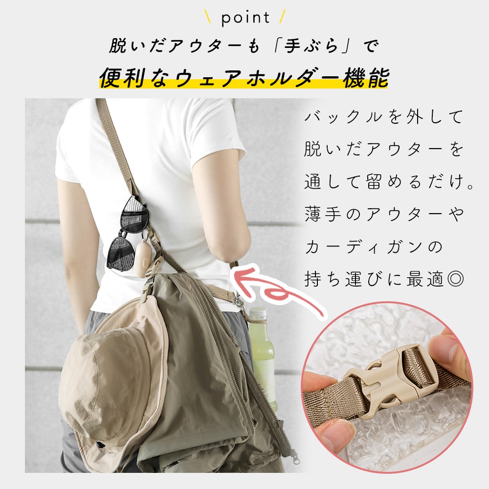 スマホ、ペットボトル、帽子、鍵、サングラスなど、外出時に欠かせないアイテムを一つにまとめられる構造。バッグを持たずに行動できるため、買い物や散歩、子どもとのお出かけなど、両手を空けたい場面で重宝します。持ち替えや探す手間を減らし、行動をスムーズにします。
