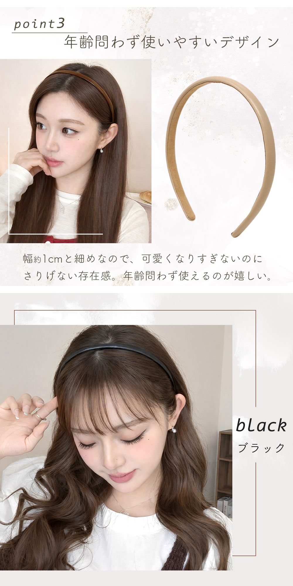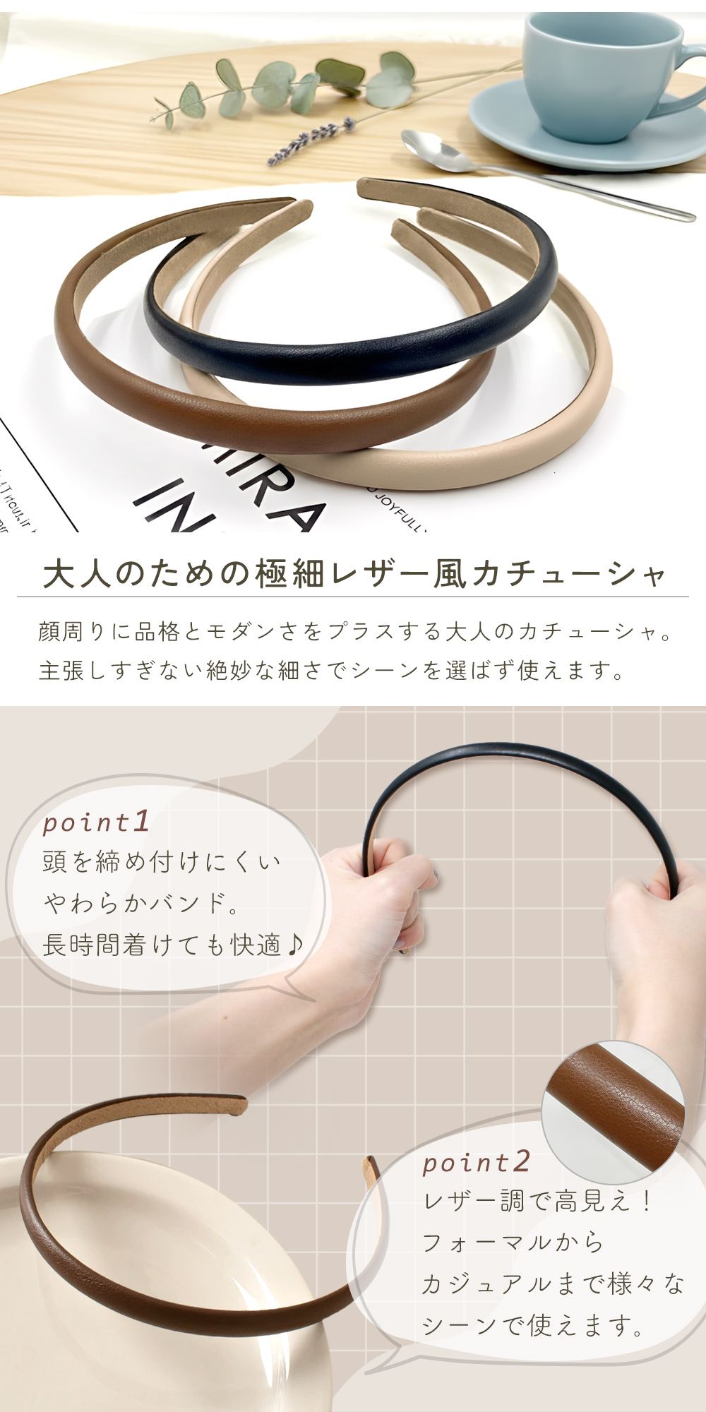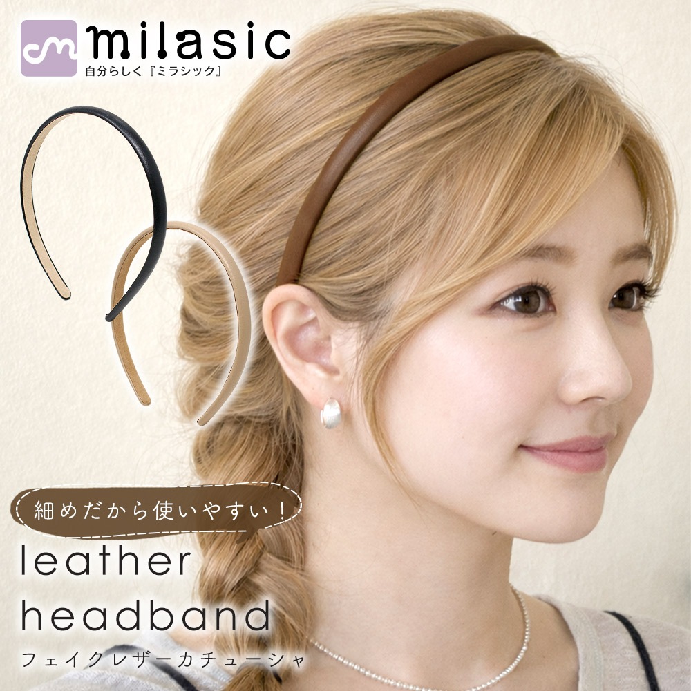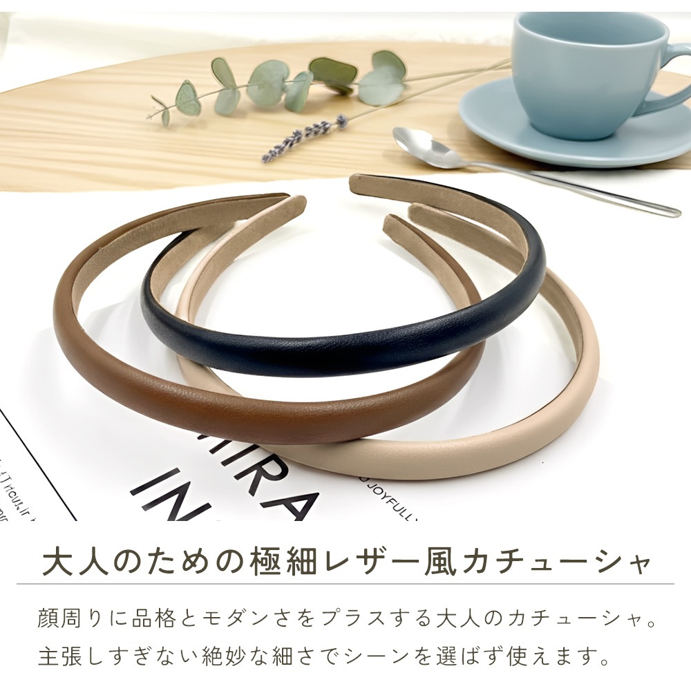 ・大人の装いに馴染む極細レザー風カチューシャ