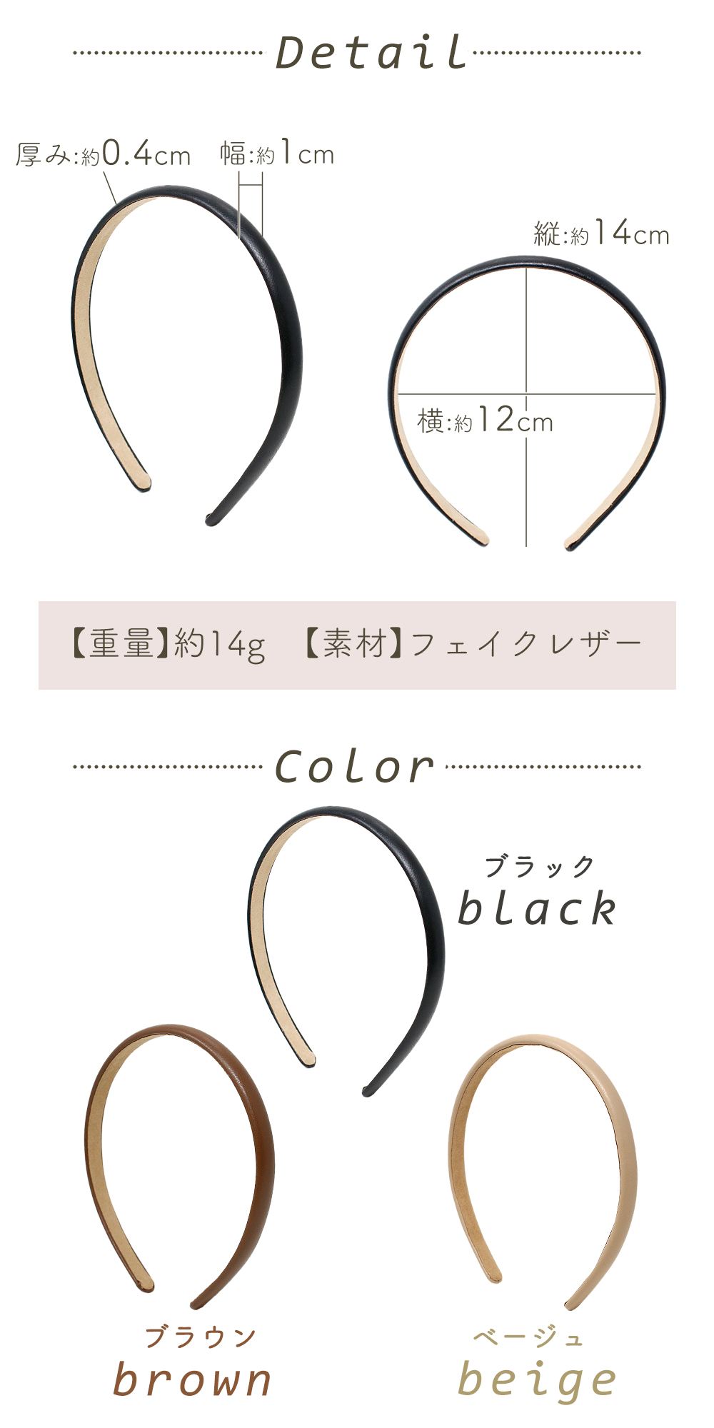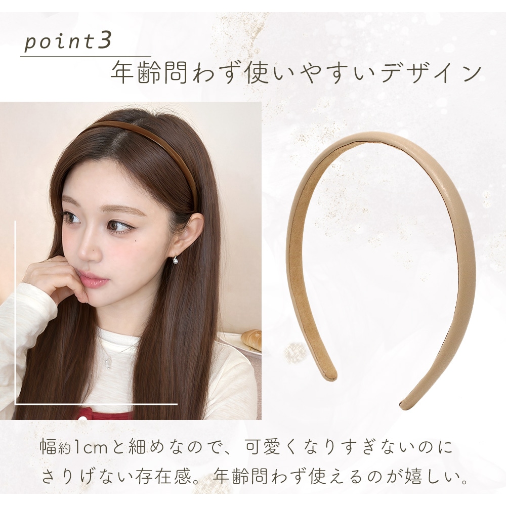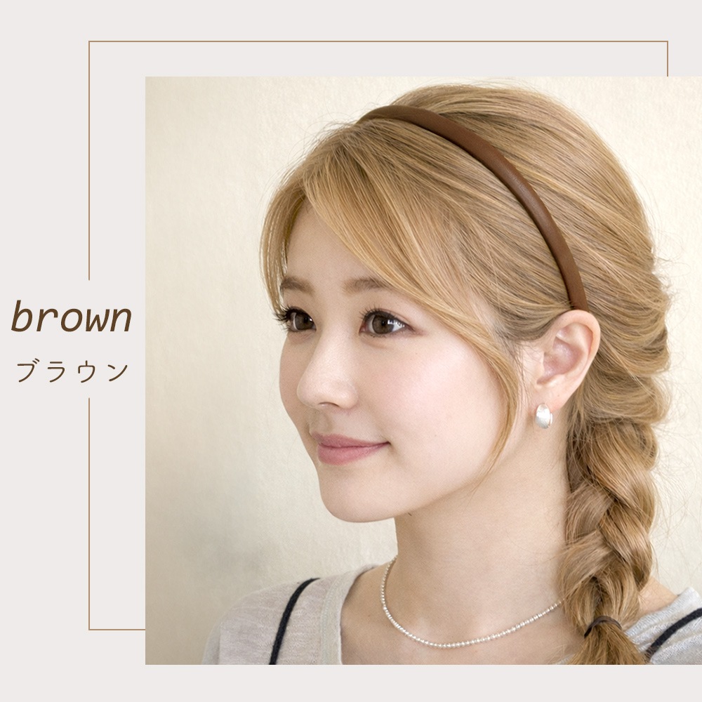 極細のPUレザーを使用し、顔周りをすっきりと上品に整える大人向けヘアアクセサリです。主張しすぎない細さと上質感のある風合いで、シンプルながらも高見えする印象に。レディース向けの落ち着いたデザインで、普段使いからきれいめスタイルまで幅広く活躍します。