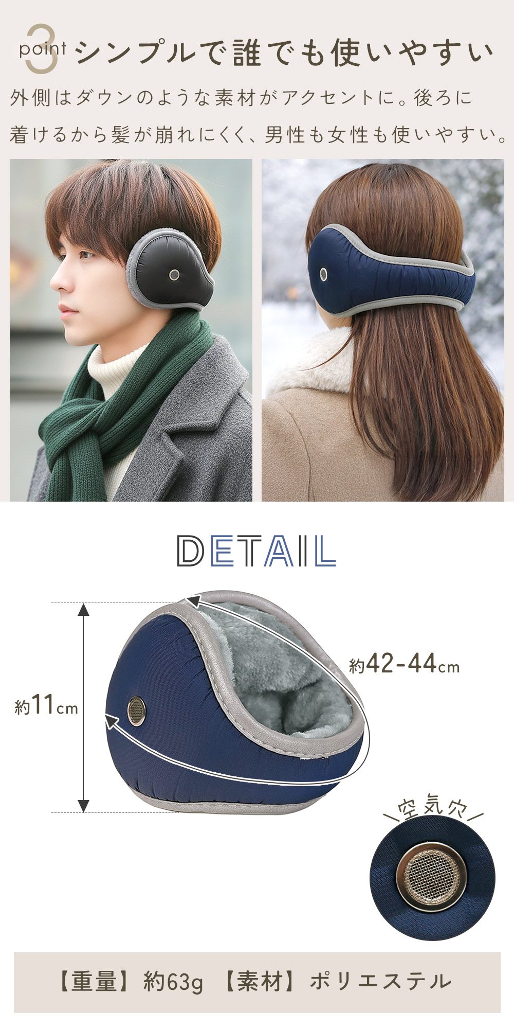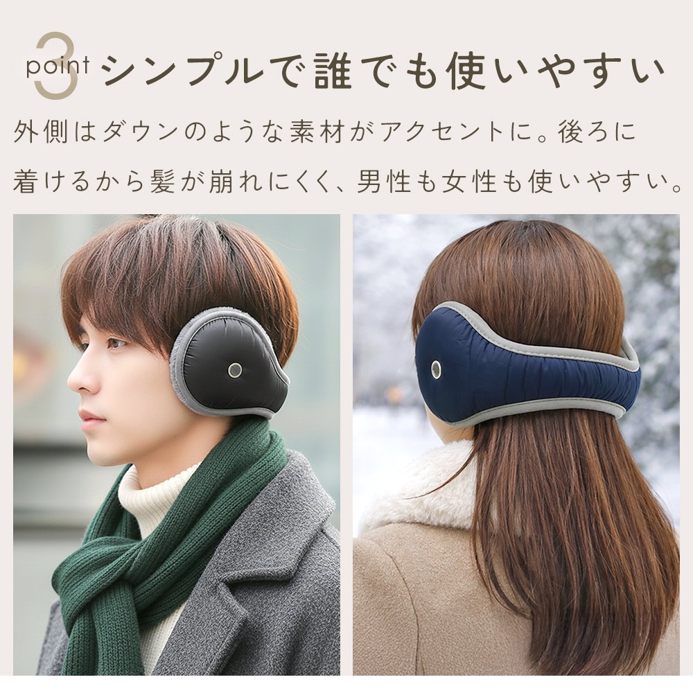 後ろ掛け仕様のイヤーウォーマーは、装着時に髪を押さえにくく、ヘアスタイルが乱れにくいのが特長。