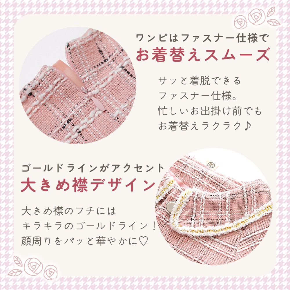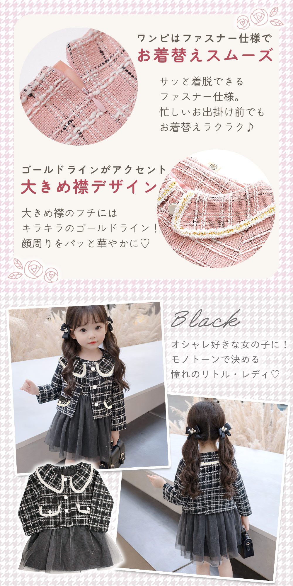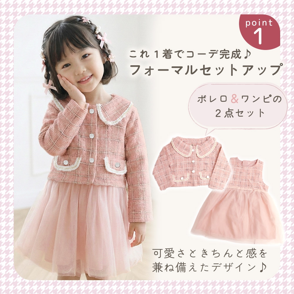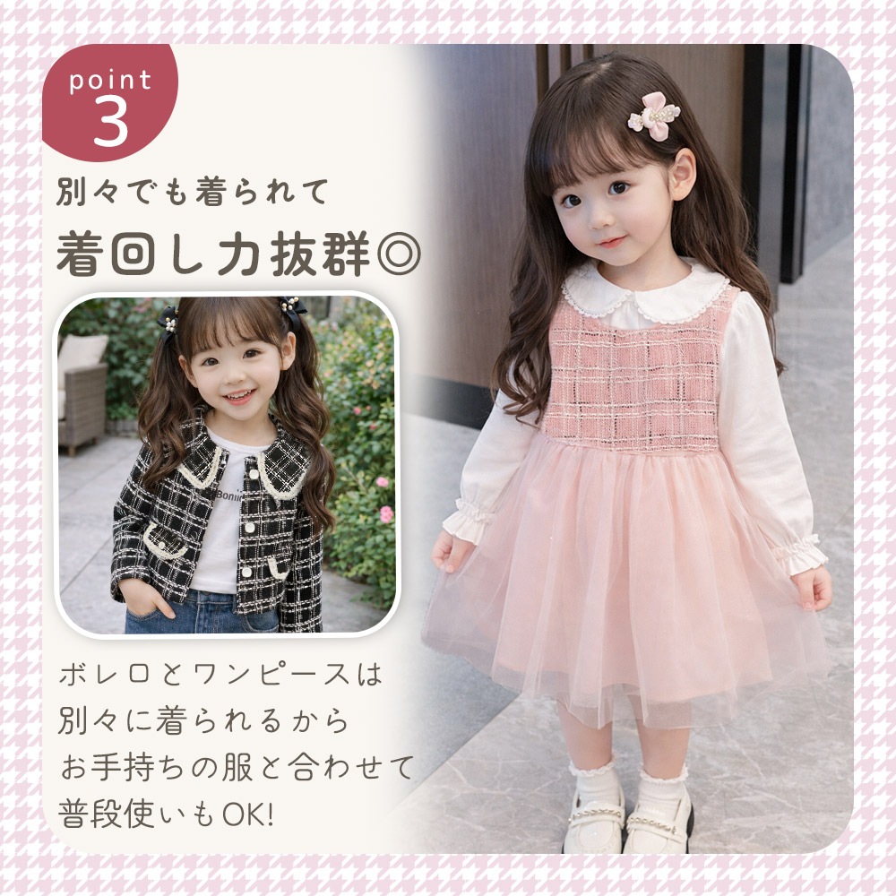 ツイード柄のボレロは、襟元やボタンなど細部までこだわったデザイン。長袖なので春・秋・冬に活躍し、フォーマル感をしっかり演出します。女児らしい可愛さを残しつつ、おしゃれに見えるバランスに仕上げました。