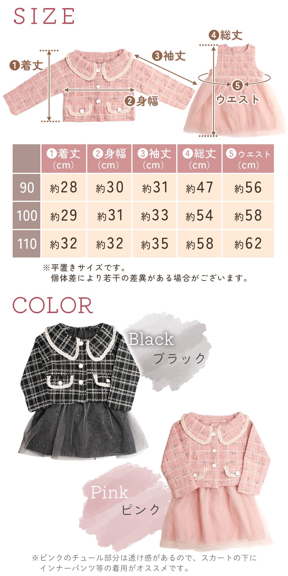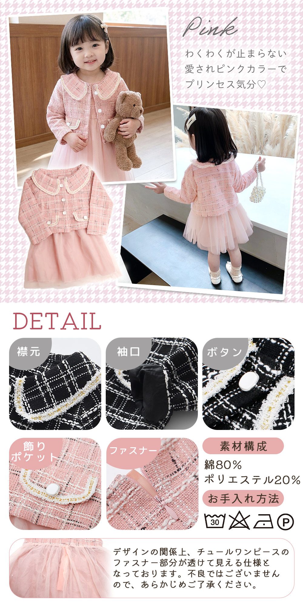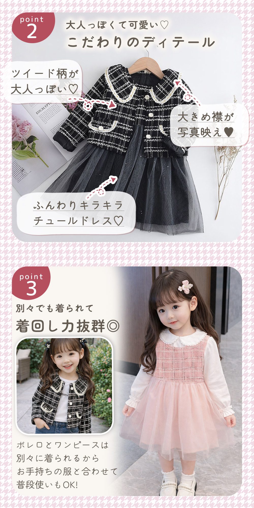 ツイード柄のボレロは、襟元やボタンなど細部までこだわったデザイン。長袖なので春・秋・冬に活躍し、フォーマル感をしっかり演出します。女児らしい可愛さを残しつつ、おしゃれに見えるバランスに仕上げました。