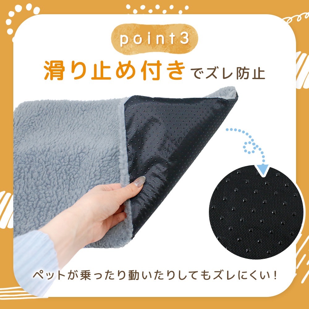 裏面は滑り止め付きでズレ防止。ペットが乗り降りしたり、寝返りをうっても位置がズレにくく、落ち着いて過ごしやすいのがポイントです。