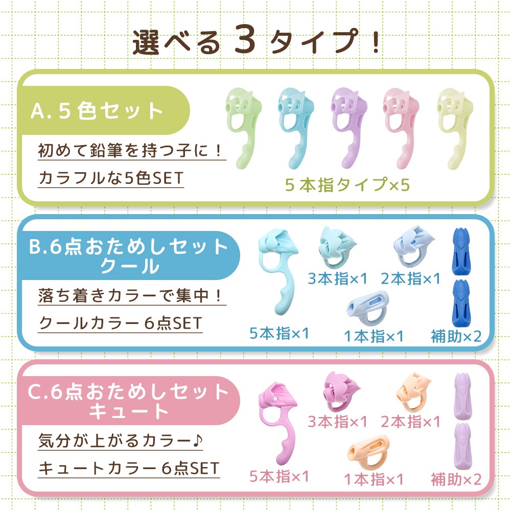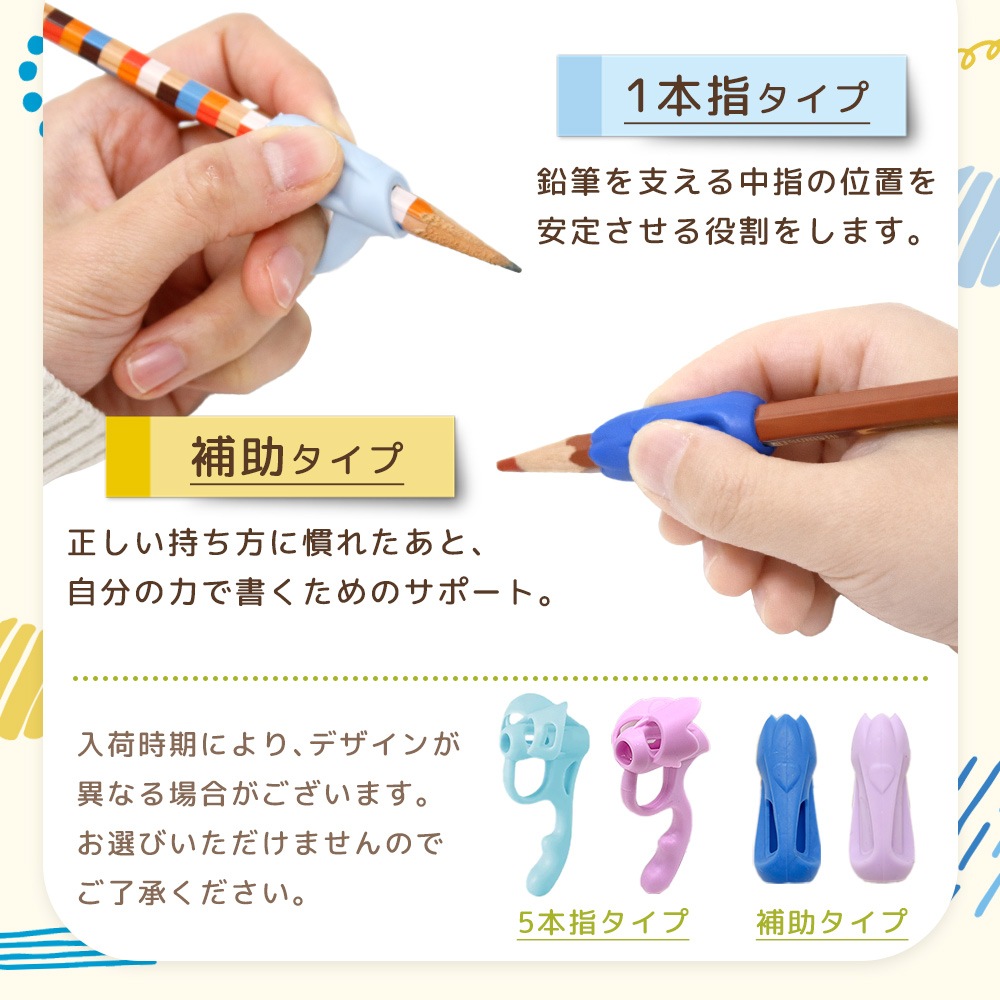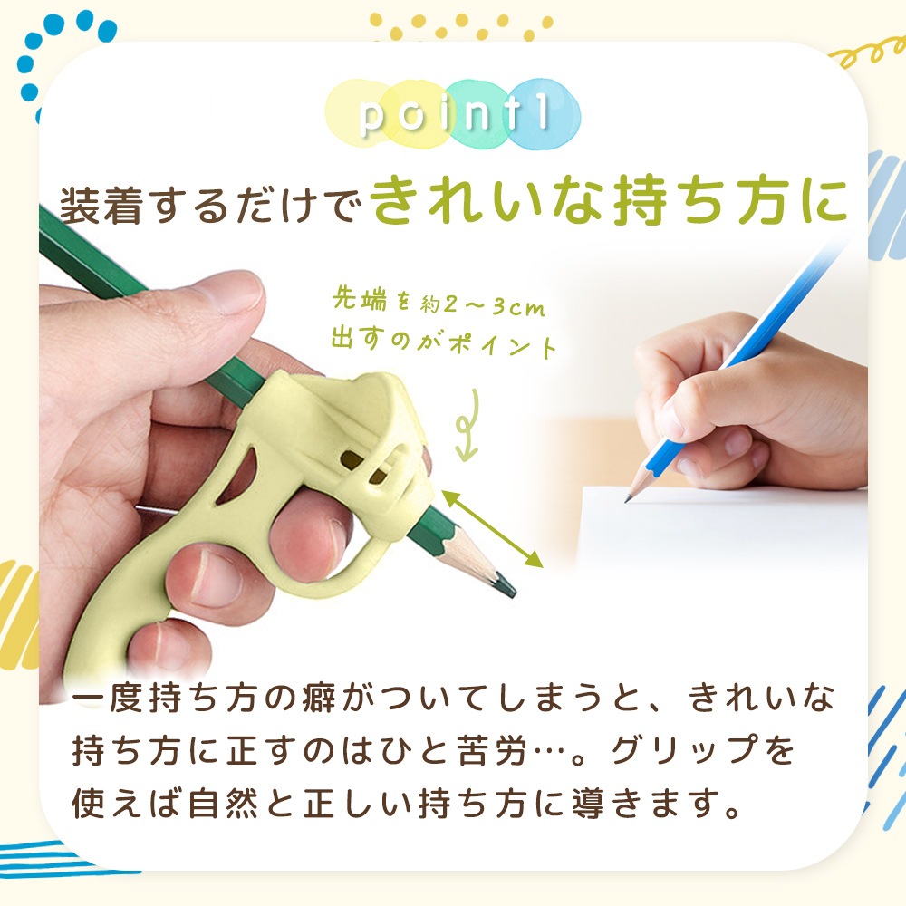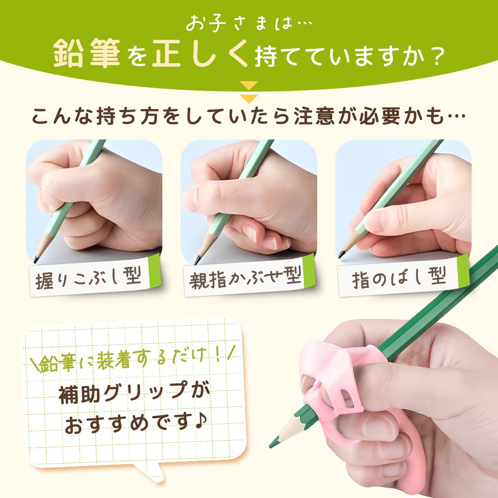 鉛筆の持ち方が安定しにくい子どもでも、指の位置が分かりやすい補助具です。えんぴつの持ち方を毎日の勉強の中で少しずつ習得できるようサポートします。